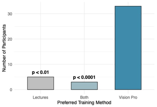 Student preferences for future training methods are presented in Figure 8. When asked, “If you could choose between the training methods (lecture or Vision Pro app), which would you prefer for learning similar content in the future?”, the majority of students (80.5%) indicated a preference for the MR-trained method. Although only the experimental group experienced the MR-trained firsthand, lecture-trained students were provided with a brief description of the app’s functionality before being asked about their future preferences. Binomial tests revealed that “Vision Pro” was selected significantly more often than “Both” (p < 0.0001) and “Lectures” (p < 0.01). When stratified by training group, both MR-trained and lecture-trained students expressed a stronger preference for Vision Pro. A Chi-square test indicated no significant effect of training group on training preference (p > 0.05).