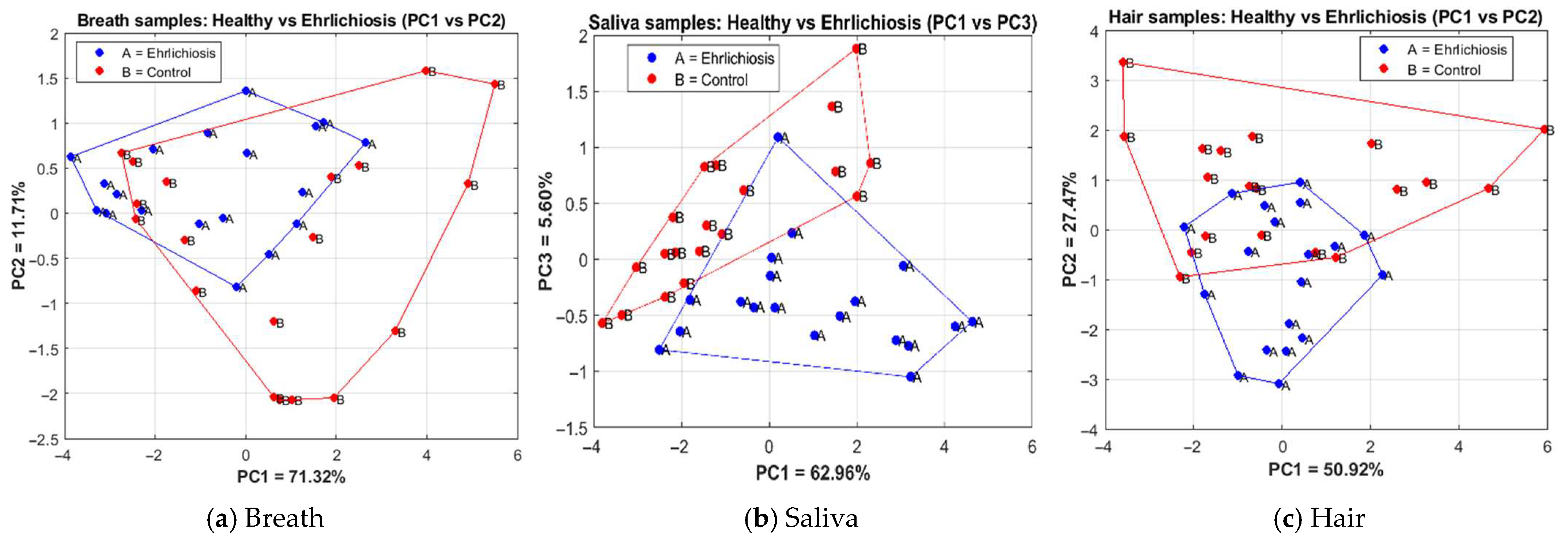 - For breath samples, the explained variance was PC1 = 71.32% and PC2 = 11.71%, with a cumulative variance of PC1–PC2 = 83.03%.