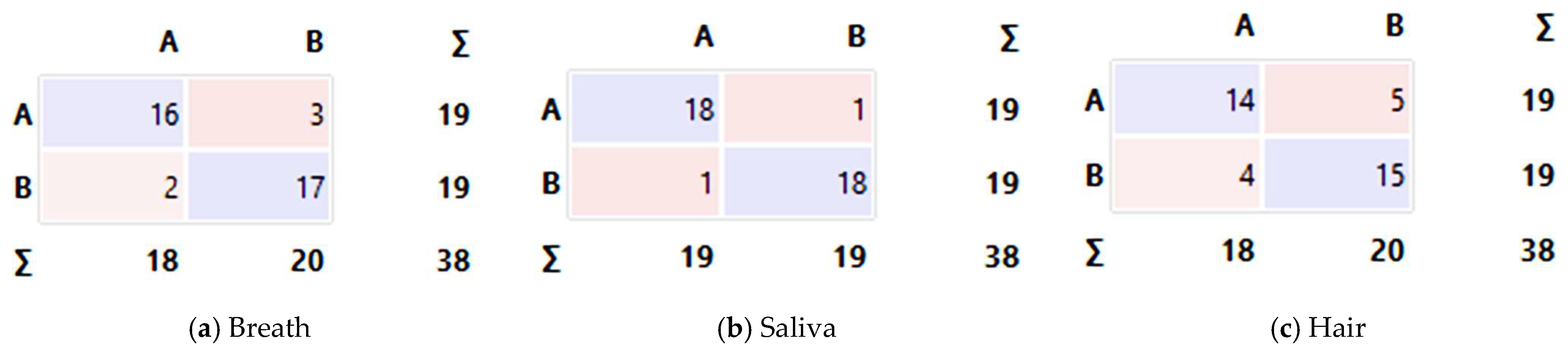 - Saliva (Figure 11b). This modality yielded the best performance, with 18 TP and 18 TN, and only 1 FN and 1 FP. These results demonstrate a strong discriminative capability for this sample type.