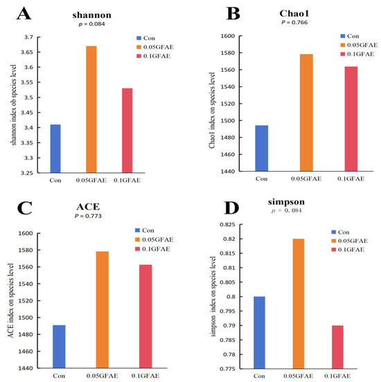Alpha diversity characterizes the richness and evenness of microbial species, with the Chao1 and ACE indices employed to quantify species richness, and the Shannon and Simpson indices used to gauge species evenness. Following 60 days of dietary GFAE supplementation, the α-diversity of ruminal microbiota among all experimental groups was evaluated via these four indices (Figure 1). The results demonstrated that in comparison with the CON group, the 0.05 GFAE supplemented group exhibited a noticeable upward tendency in both the Shannon (p = 0.084) and Simpson (p = 0.084) diversity indices; nevertheless, these observed variations did not reach statistical significance.