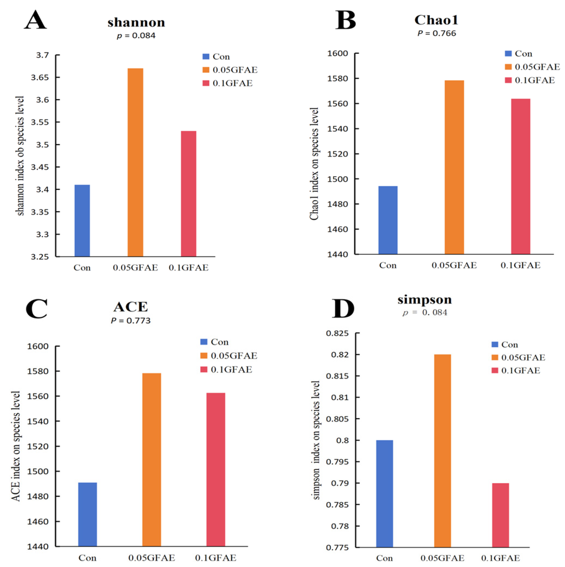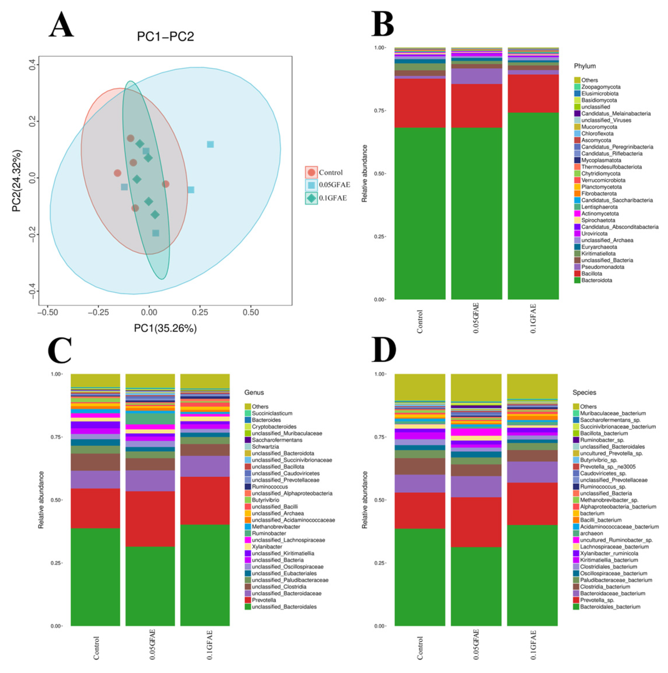 56]. Results indicated that GFAE supplementation did not significantly affect ruminal microbiota alpha or beta diversity. At the phylum level, GFAE increased