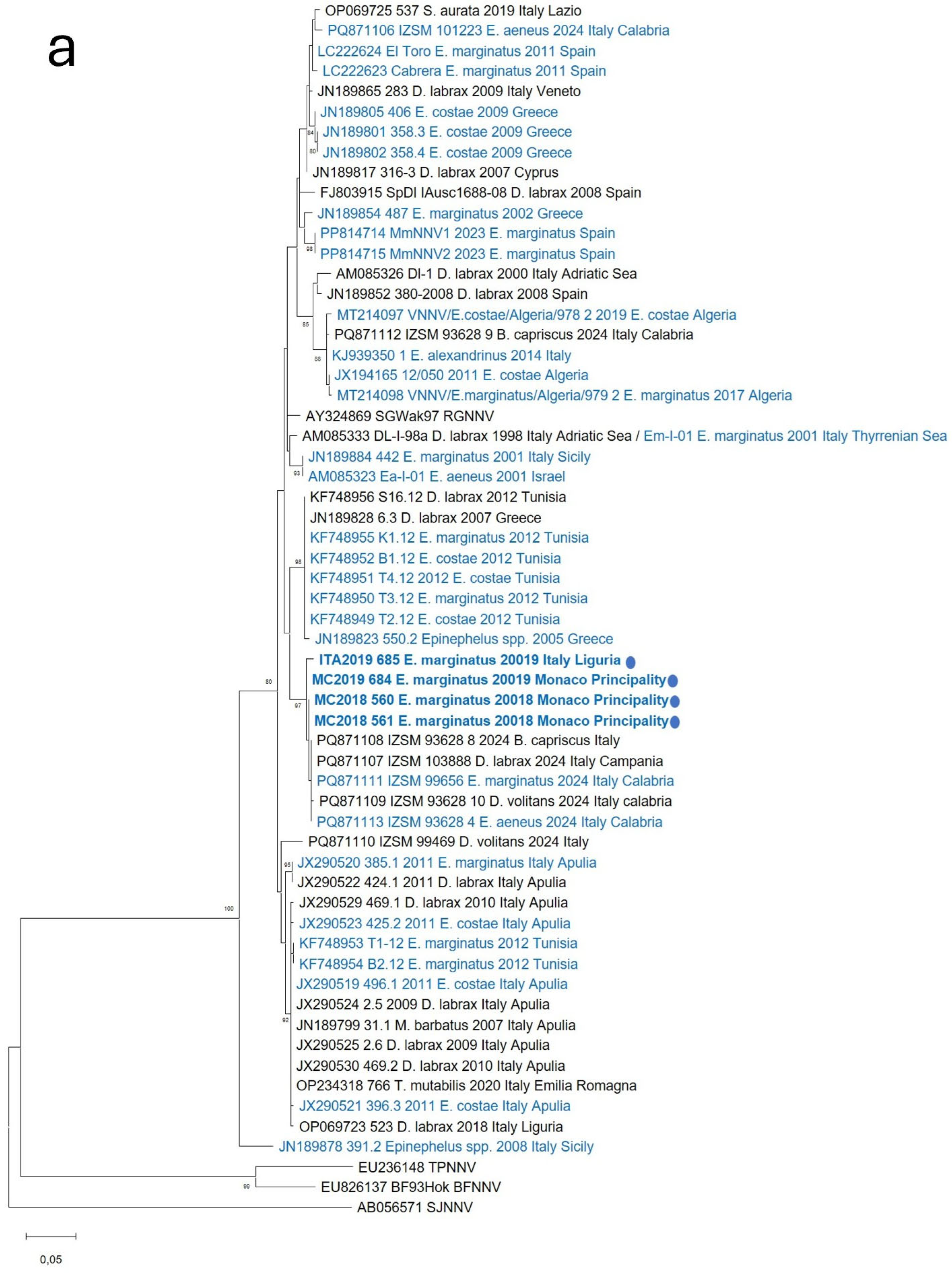 - Panzarin, V.; Fusaro, A.; Monne, I.; Cappellozza, E.; Patarnello, P.; Bovo, G.; Capua, I.; Holmes, E.C.; Cattoli, G. Molecular Epidemiology and Evolutionary Dynamics of Betanodavirus in Southern Europe. Infect. Genet. Evol. 2012, 12, 63–70. [Google Scholar] [CrossRef]