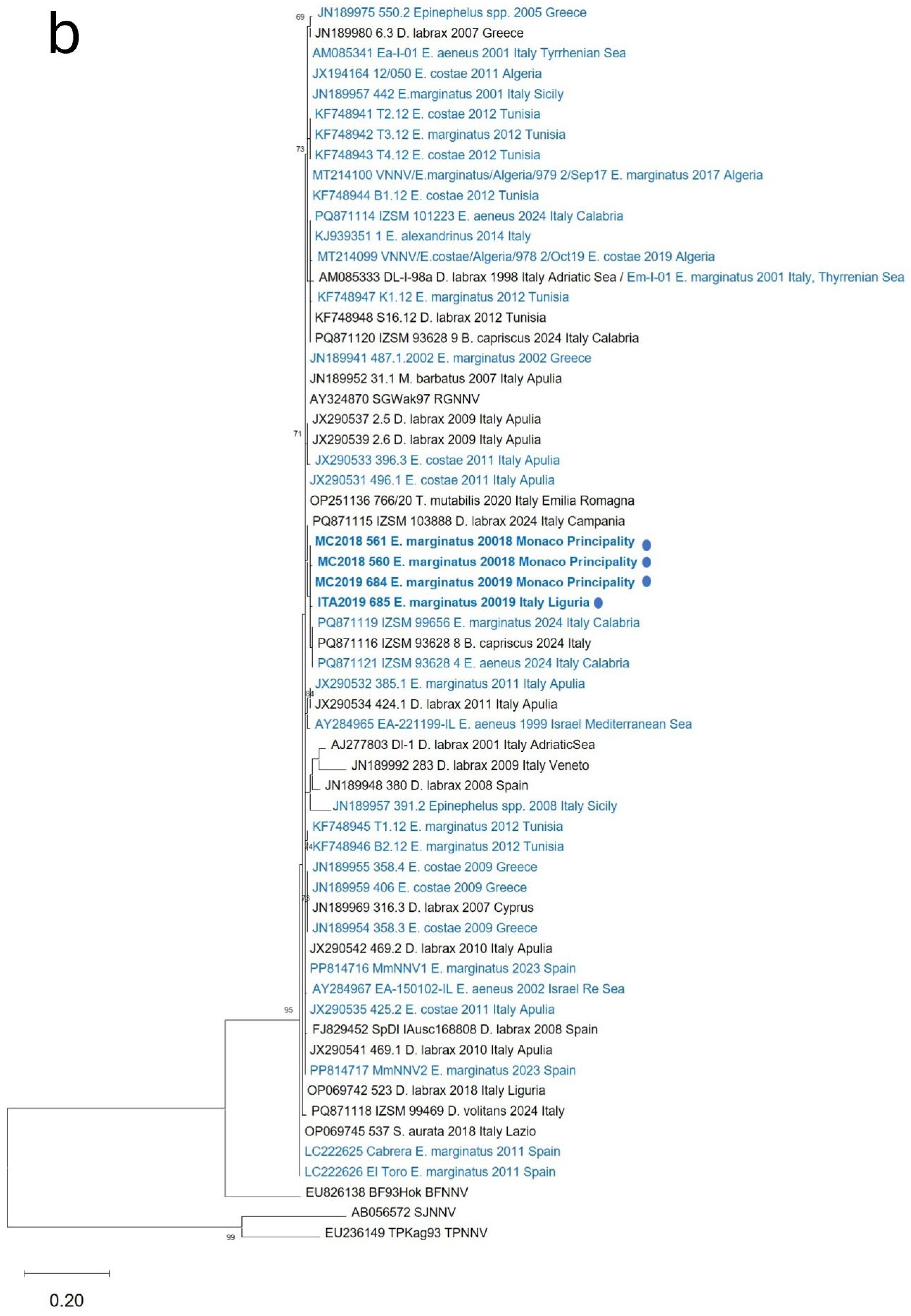 - Esposito, E.; Oliviero, M.; Iaccarino, D.; Paduano, G.; Serra, F.; Levante, M.; Amoroso, M.G.; Paradiso, R.; Rinaldi, A.; Borriello, G.; et al. First Detection of RGNNV Betanodavirus Genotype in Dactylopterus volitans (Linnaeus, 1758) and Balistes capriscus (Gmelin, 1798). J. Fish Dis. 2025, 48, e70006. [Google Scholar] [CrossRef] [PubMed]