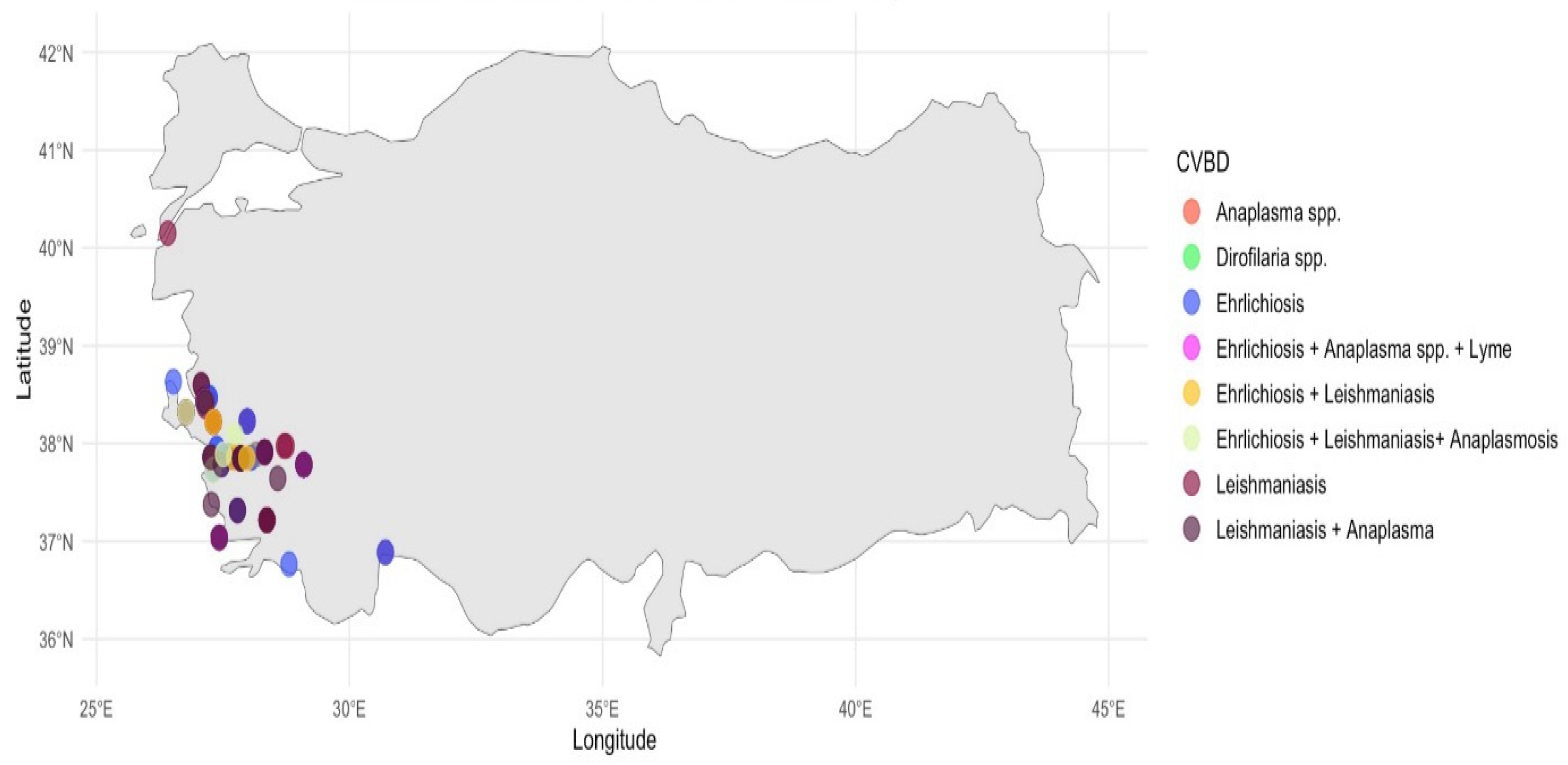 - Ural, K.; Gultekin, M.; Atasoy, A.; Ulutas, B. Spatial distribution of vector-borne disease agents in dogs in the Aegean region, Turkey. Rev. MVZ Córdoba 2014, 19, 4086–4098. [Google Scholar] [CrossRef]