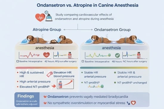 We hypothesized that ondansetron would preserve autonomic balance during anesthesia, preventing bradycardia without inducing excessive sympathetic activation, and would not be associated with postoperative increases in NT-proBNP concentrations. By addressing the need for anesthetic strategies that support autonomic stability while reducing cardiac workload, this study aims to provide clinically relevant evidence for the incorporation of ondansetron into multimodal anesthetic protocols in dogs.