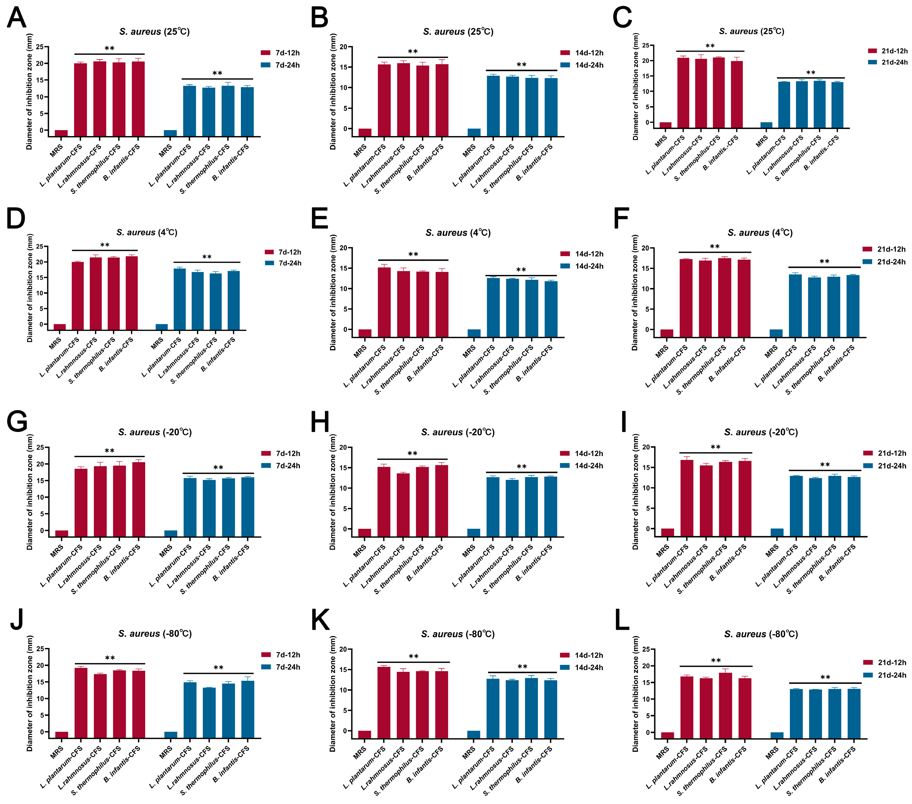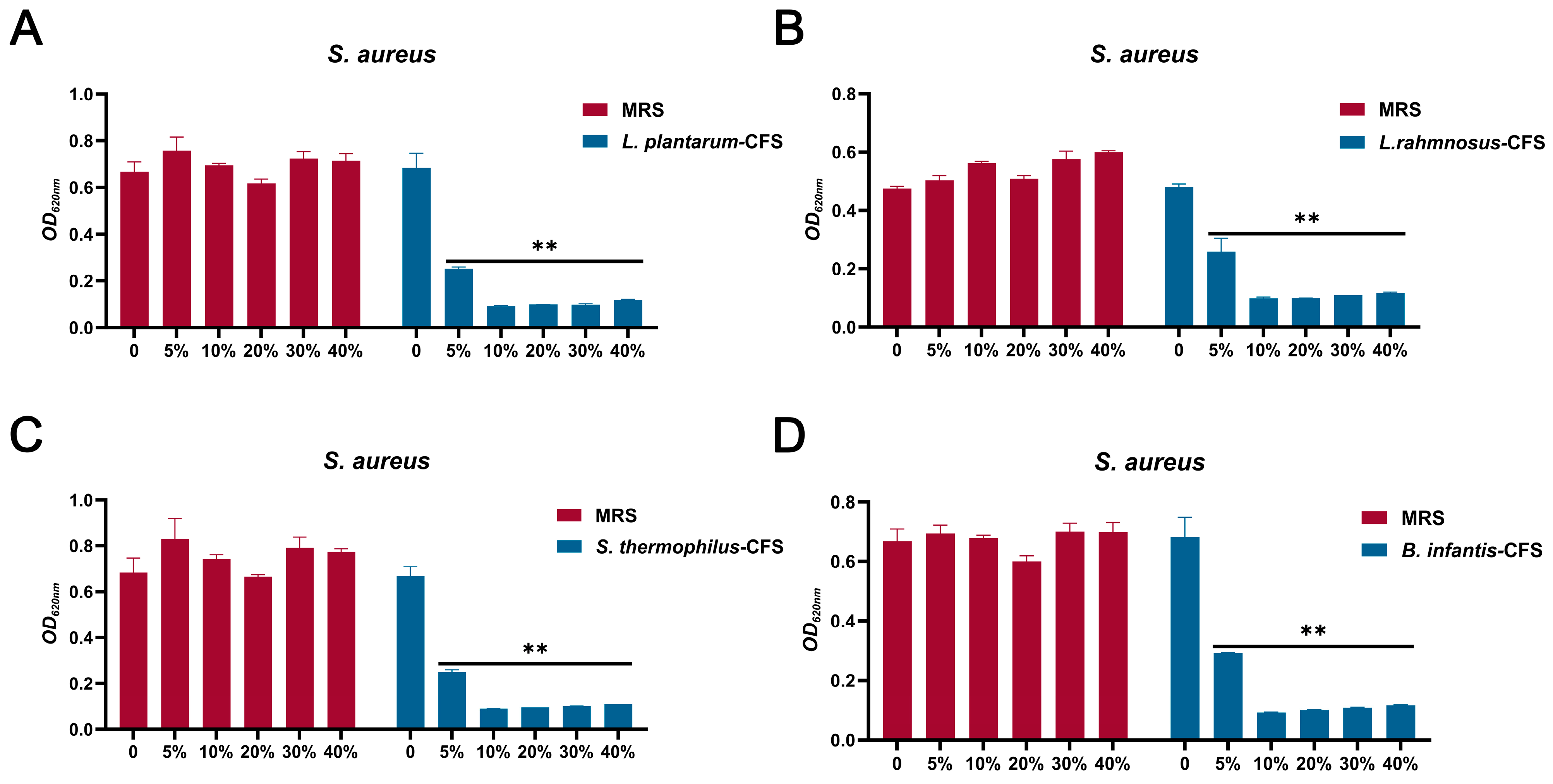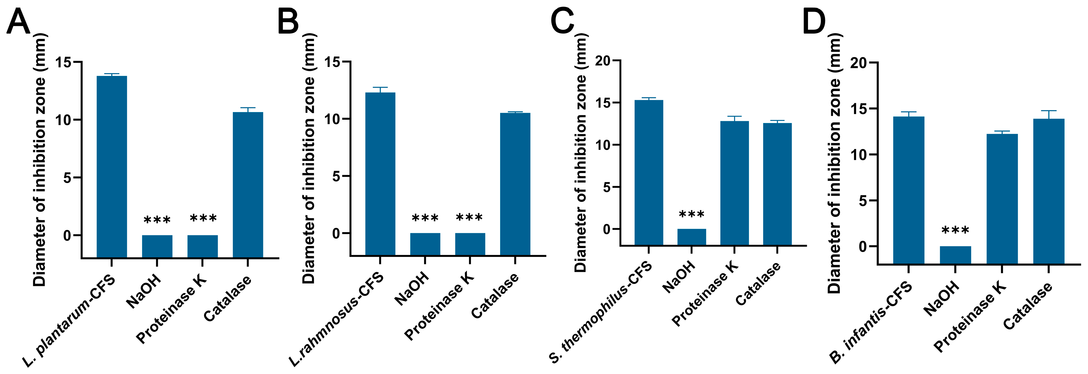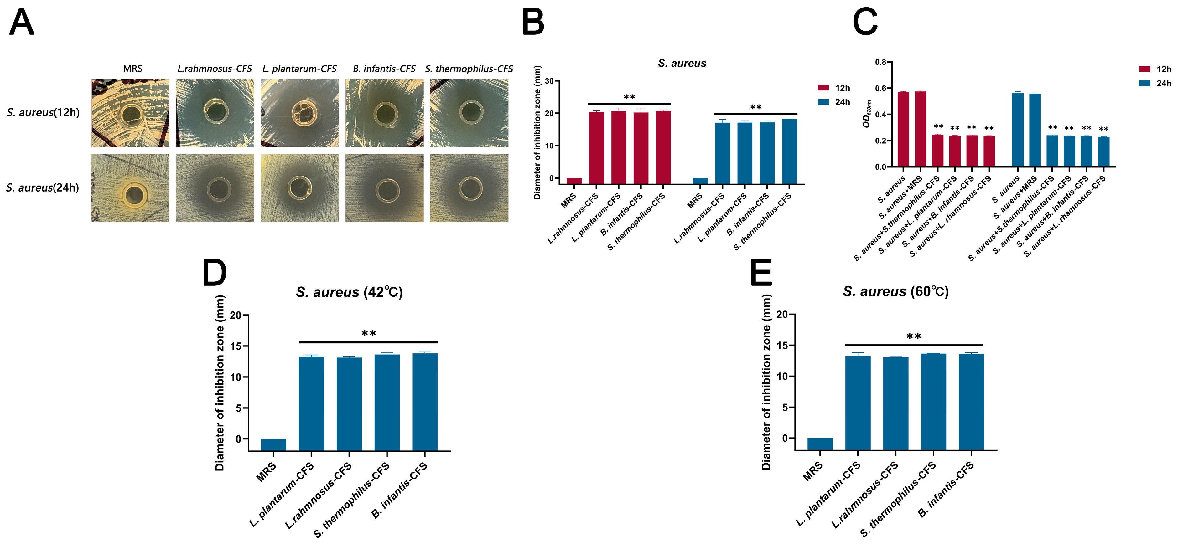 3.1. Inhibition of CFSs of L. plantarum, L. rhamnosus, B. infantis, and S. thermophilus on S. aureus