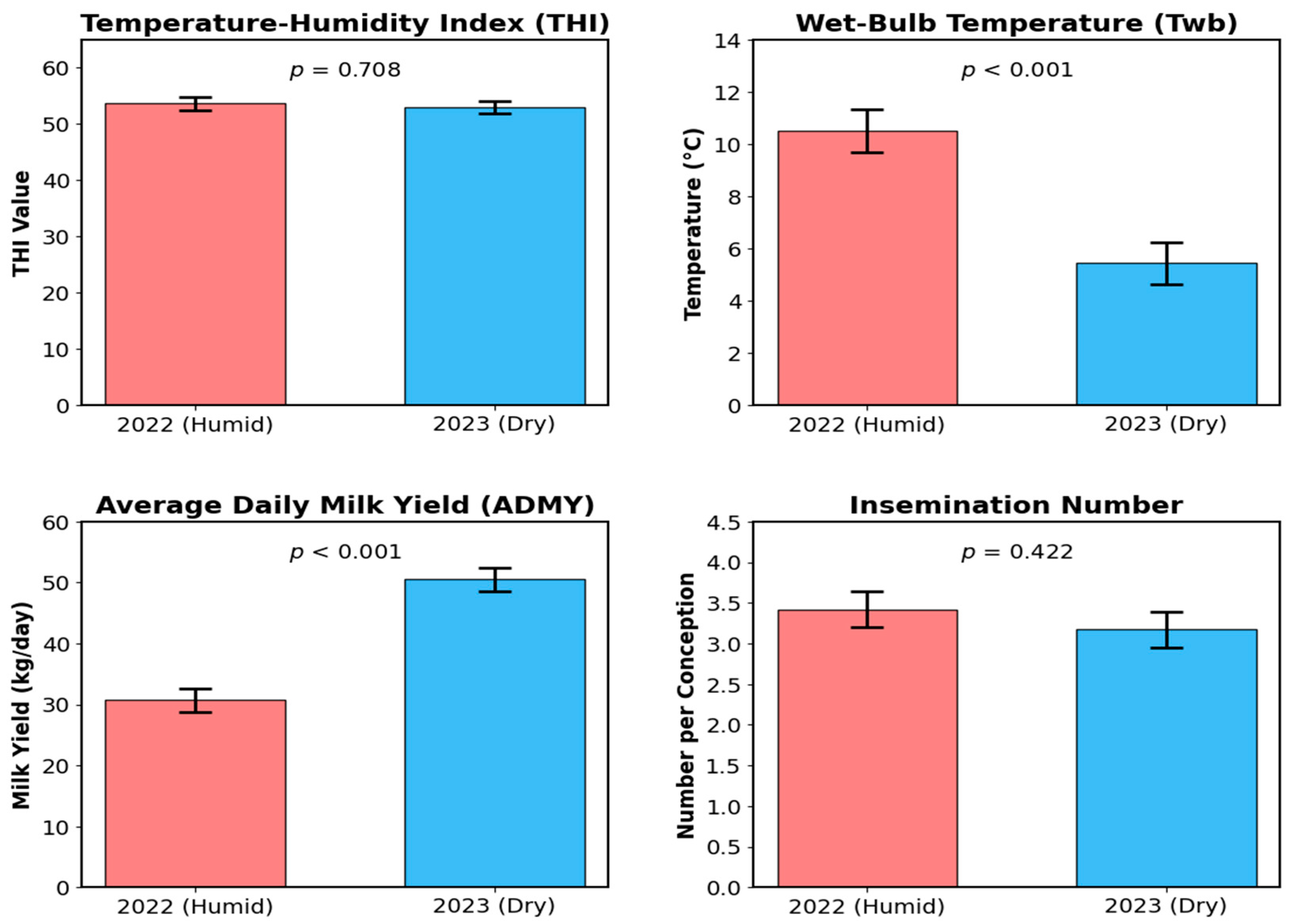 - Jo, J.; Lee, H. Impact of Relative Humidity on Heat Stress Responses in Early-Lactation Holstein Cows. Animals 2025, 15, 1503. [Google Scholar] [CrossRef]
