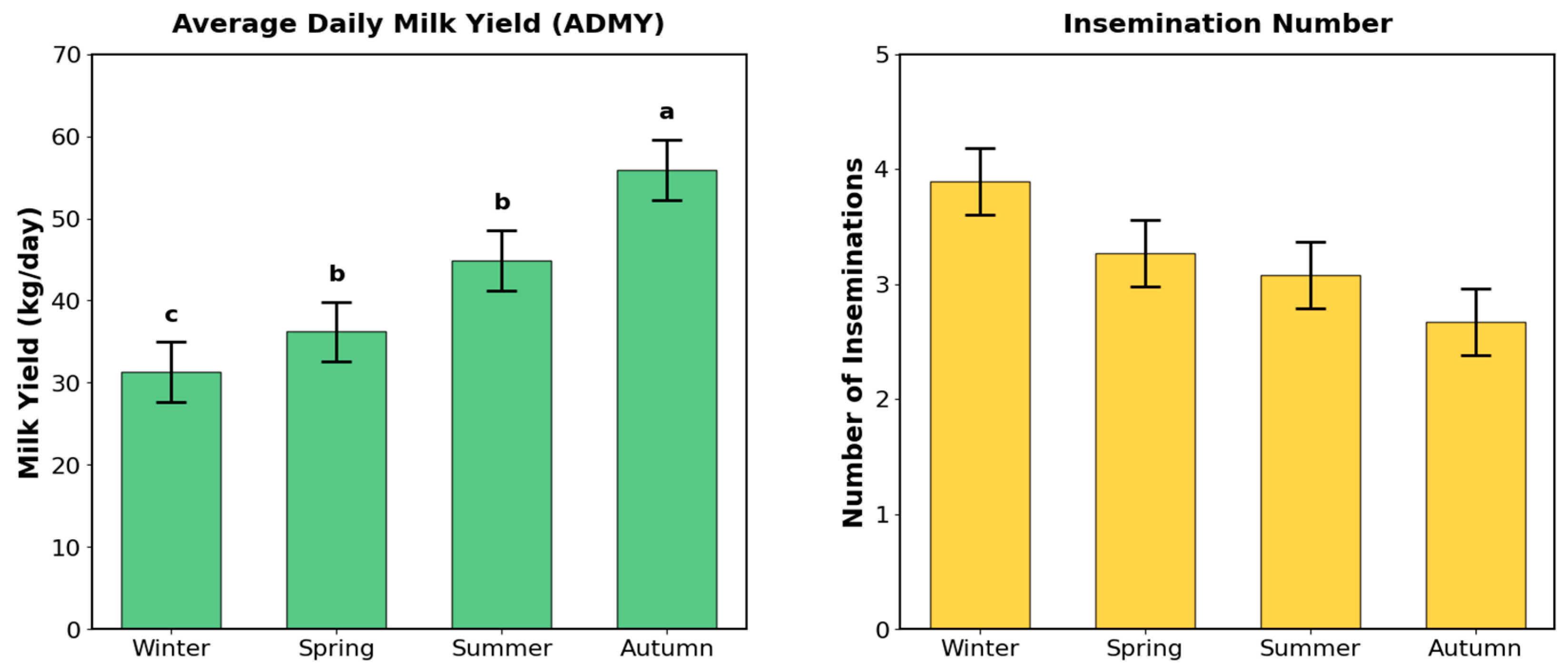 | Season | N | ADMY (kg/Day) | Insemination Number |