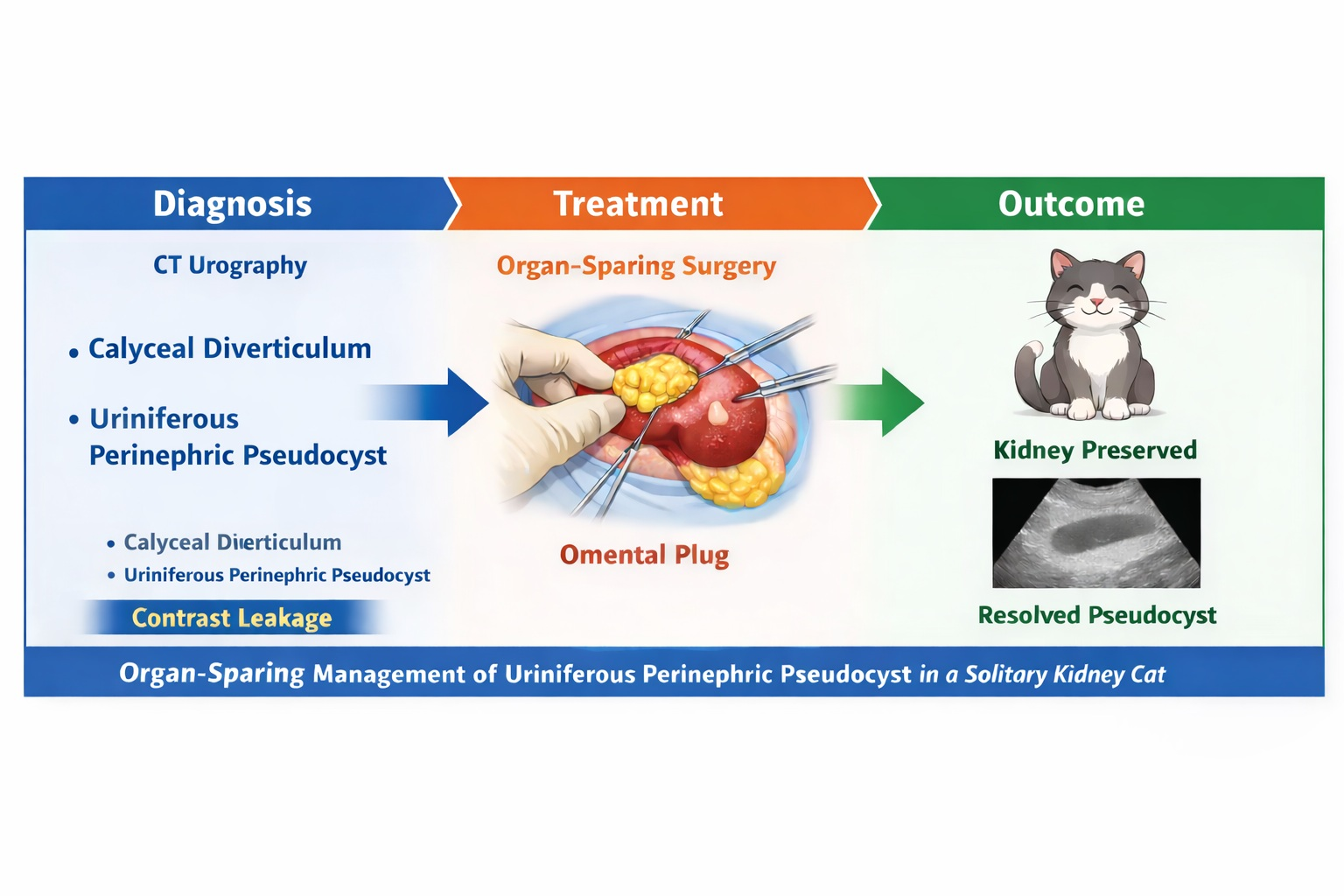 This case report describes a PNP associated with the formation of an open tract directly connecting the calyceal diverticulum to the subcapsular space in a cat with a solitary kidney. Using contrast-enhanced CT, the origin and progression pathways of the urinary leakage were identified, and the condition was successfully managed with an organ-sparing approach using omentalization.