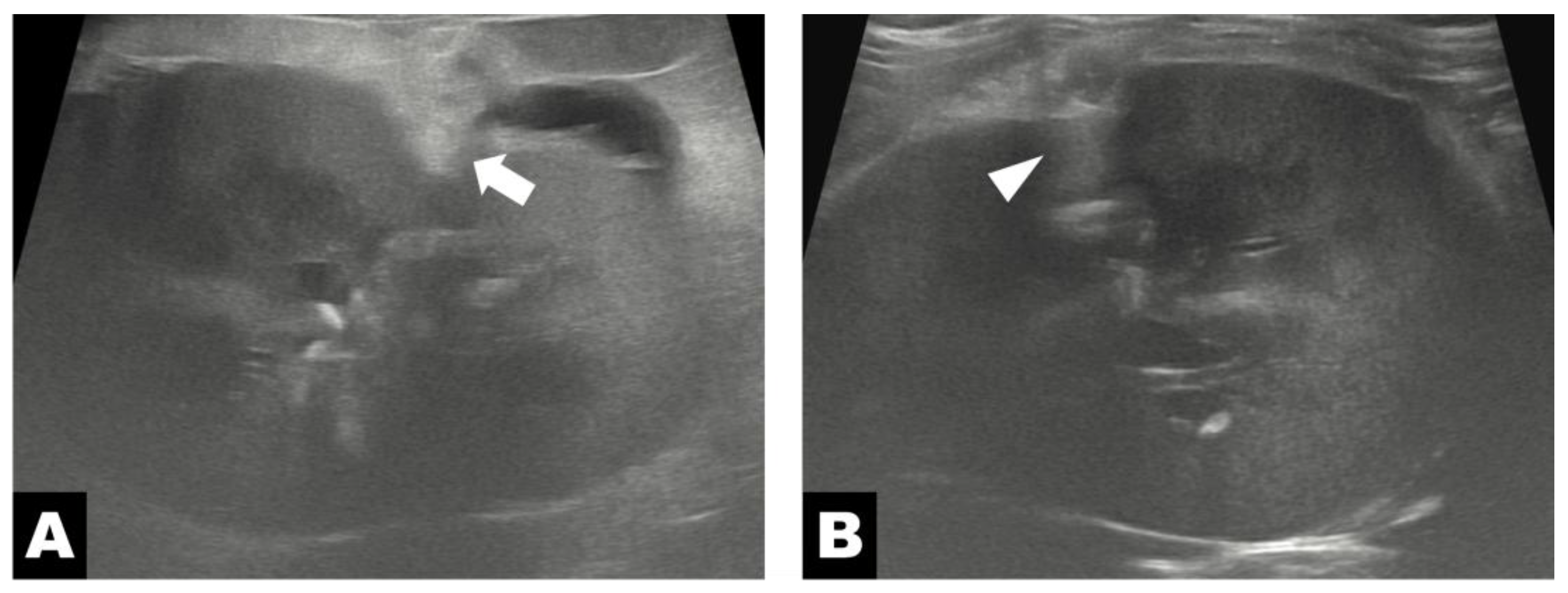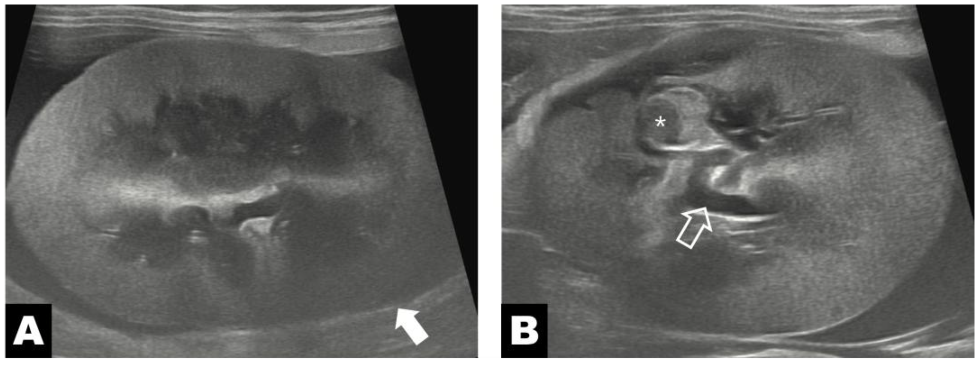 Figure 4B), whereas the previously noted increase in perinephric fat echogenicity and perinephric fluid accumulation had resolved. Follow-up evaluation showed a renal volume of 30.84 cm