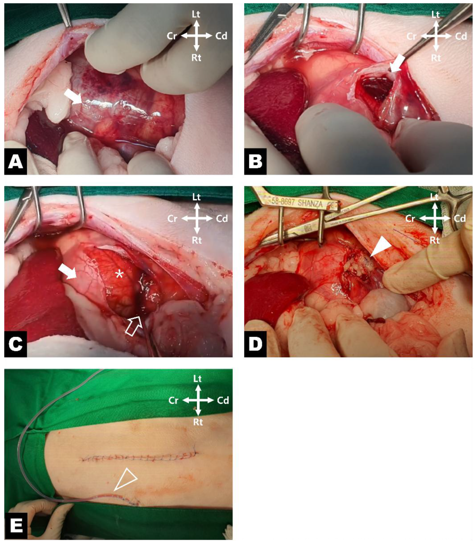 Postoperative analgesia was provided using local infiltration of 0.5% bupivacaine (1 mg/kg SC; Myungmoon Bupivacaine®, Myungmoon Pharm, Seoul, Republic of Korea) along the incision line immediately after surgery, combined with tramadol (2 mg/kg, IV; Tramadol HCl Inj., Shinpoong Pharm, Seoul, Republic of Korea). Postoperative antimicrobial therapy consisted of cefotaxime (30 mg/kg IV; Unitaxime® Inj., Union Pharm, Wonju, Republic of Korea) for 5 days. In addition, famotidine (0.5 mg/kg IV; Gaster® inj., DongA-st, Seoul, Republic of Korea) was administered as a gastrointestinal protectant for 5 days. Intravenous fluid therapy was provided using Plaju OP (Plaju OP® Inj., JW-phrama, Dangjin, Republic of Korea) at a maintenance rate during hospitalization.
