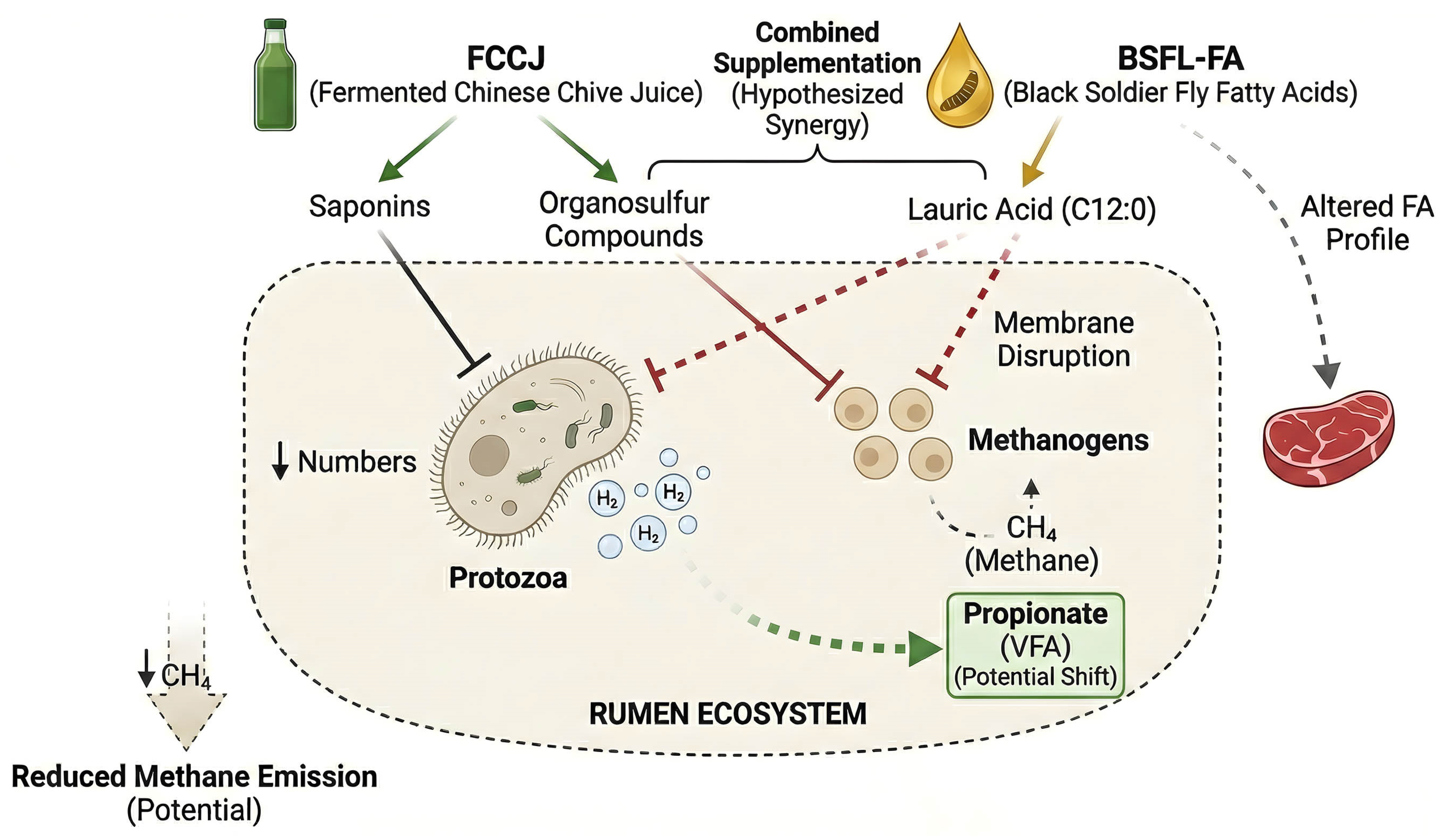 - Dual Defaunation Effect: The saponins in FCCJ and the lauric acid in BSFL-FA both effectively inhibit protozoa, cutting off a major hydrogen source for methanogens from two angles.