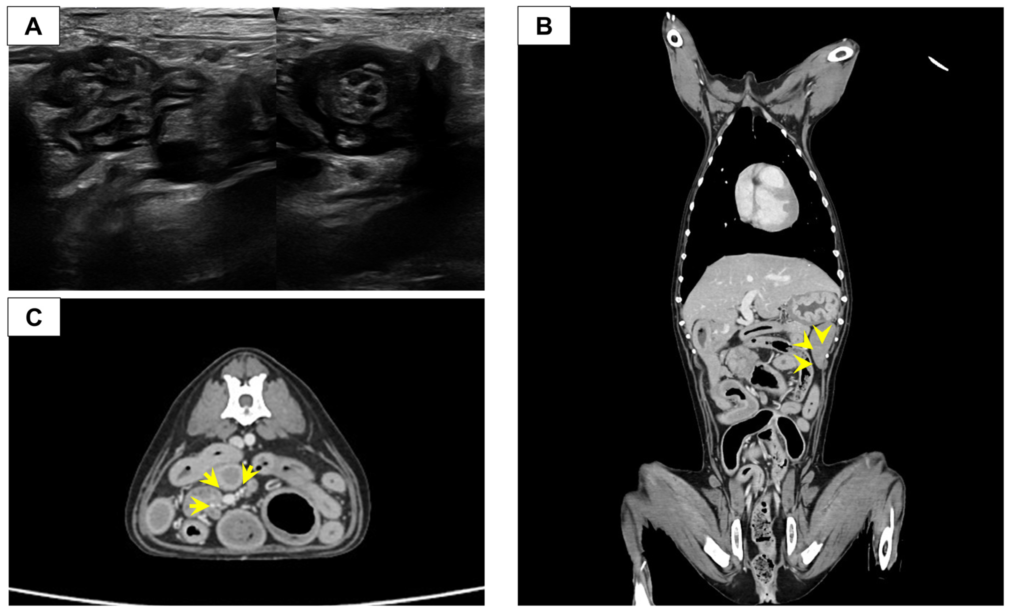 Figure 1A), raising suspicion for partial intussusception or an intestinal stricture. The intestinal wall layering was preserved, and no ultrasonographic findings were indicative of complete mechanical obstruction at the time of evaluation. Moderate enlargement of the regional lymph nodes was also noted, with heterogeneous hypoechoic parenchyma. The differential diagnoses considered included benign inflammatory disorders, such as chronic enteropathy or lipogranulomatous lymphangitis, as well as partial intussusception and intestinal neoplasia. Because the ultrasonographic findings were inconclusive and mechanical obstruction could not be ruled out, advanced diagnostic imaging was pursued for detailed characterization of the lesion and evaluation for possible malignancy.