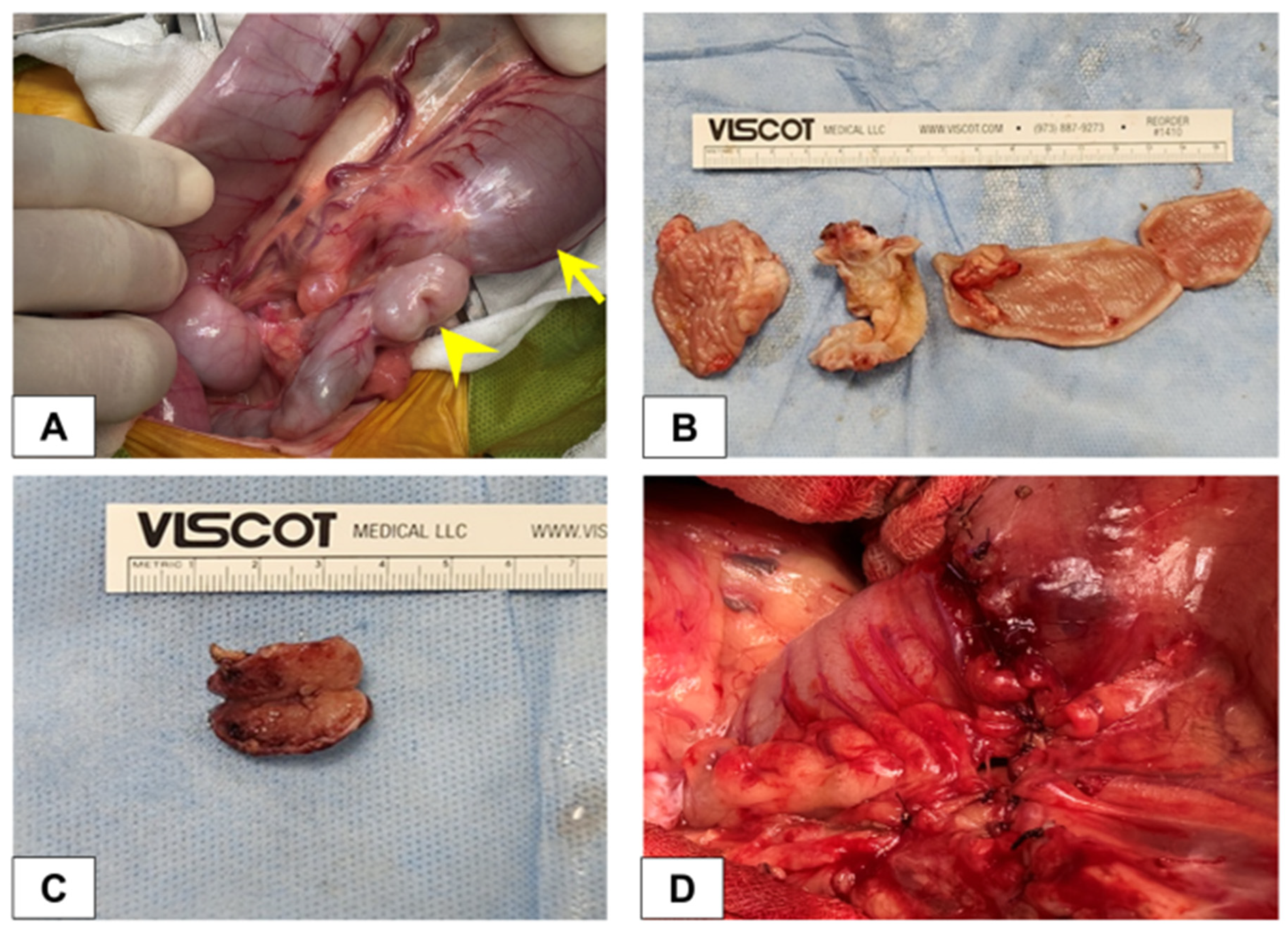 Figure 1C). Bilateral adrenal enlargement was also noted, measuring a maximum diameter of 7.6 mm at the cranial pole, which was consistent with the patient’s history of hyperadrenocorticism. Given the presence of complete mechanical obstruction and the persistent inability to exclude malignancy based on imaging findings, surgical intervention was required for both immediate alleviation and definitive histopathological diagnosis.