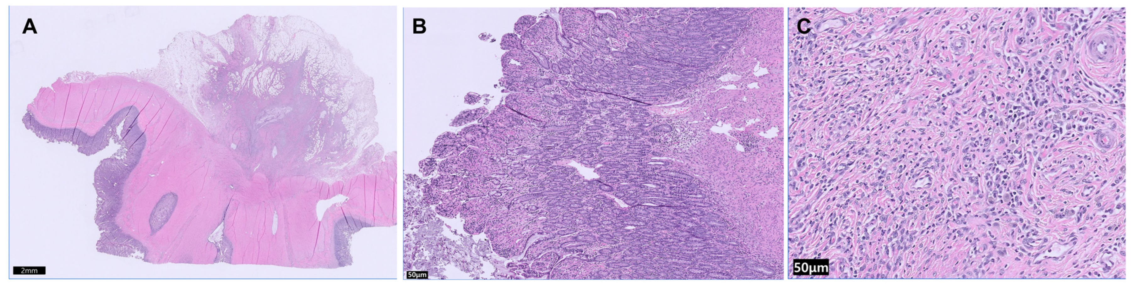 12]. It is typically characterized by a heavy infiltration of inflammatory cells, particularly eosinophils, across all layers of the intestinal wall, accompanied by widespread fibroplasia [