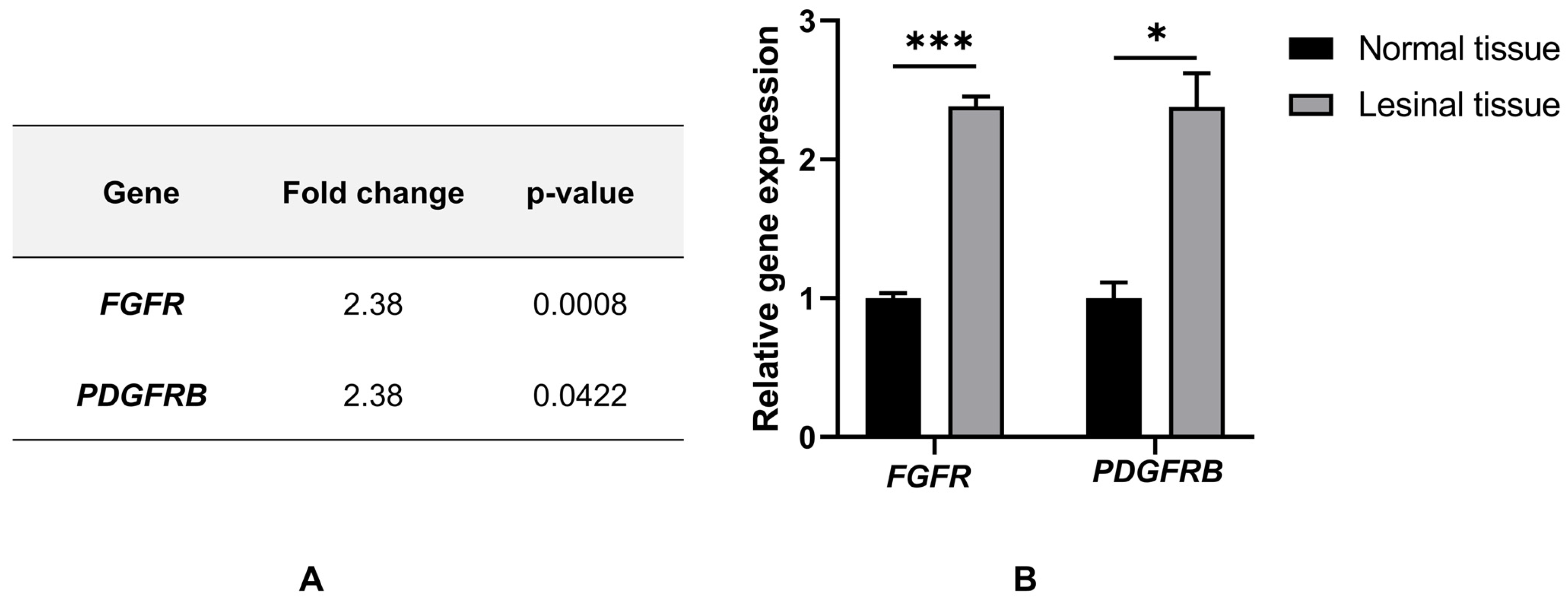 p < 0.05 considered statistically significant. Quantitative analysis demonstrated significant upregulation of mRNA expression for both fibroblast growth factor receptor (