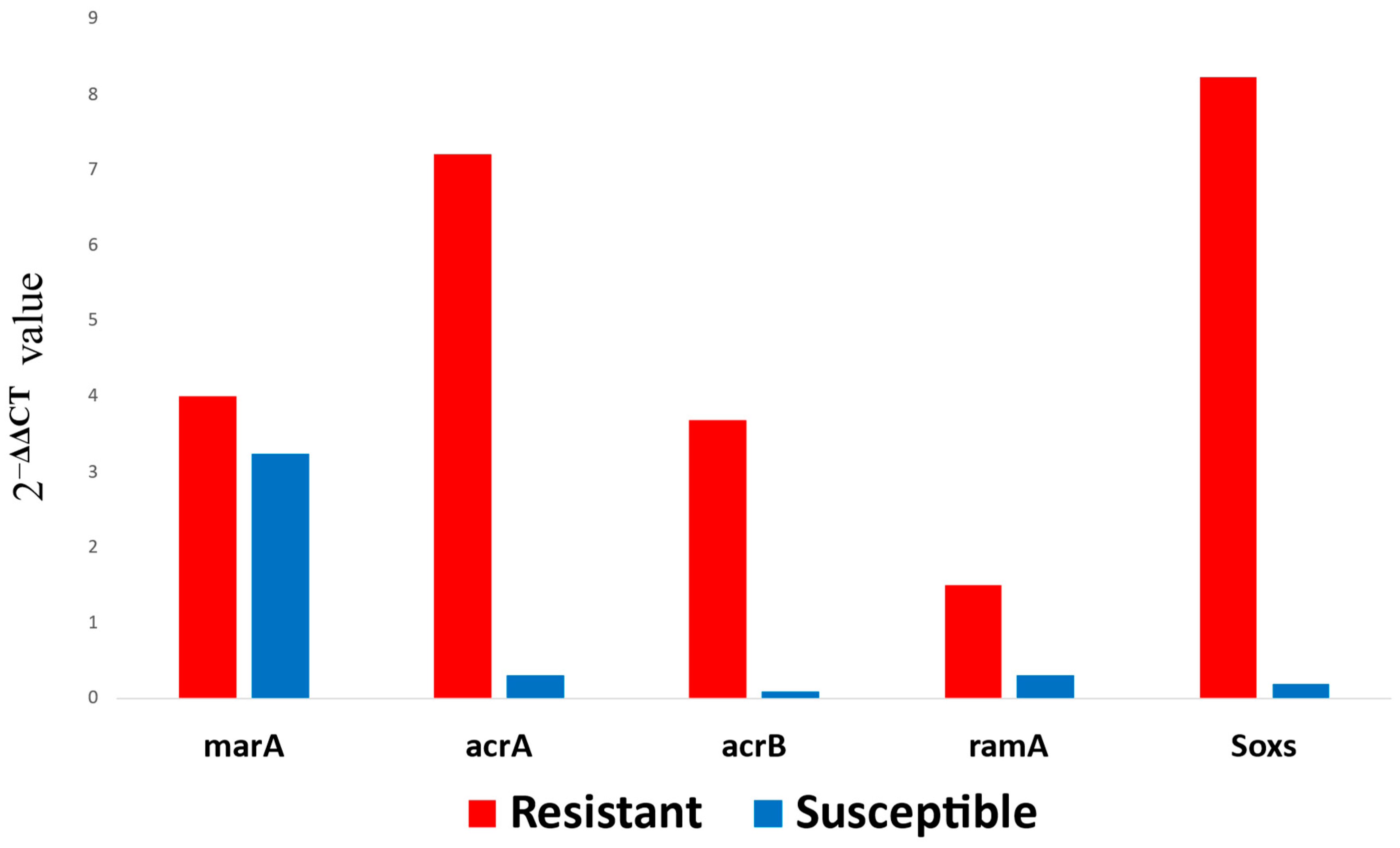 - Ferrari, R.G.; Galiana, A.; Cremades, R.; Rodríguez, J.C.; Magnani, M.; Tognim, M.C.B.; Oliveira, T.C.R.M.; Royo, G. Expression of the marA, soxS, acrB and ramA Genes Related to the AcrAB/TolC Efflux Pump in Salmonella enterica Strains with and Without Quinolone Resistance-Determining Regions gyrA Gene Mutations. Braz. J. Infect. Dis. 2013, 17, 125–130. [Google Scholar] [CrossRef] [PubMed]