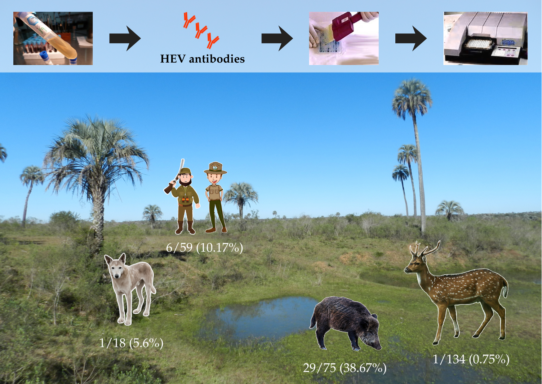 Given the lack of information on the presence and epidemiology of HEV in EPNP, and the potential exposure risks associated with hunting and handling of animal viscera, as well as the possibility of foodborne transmission to consumers, we conducted a serological survey for HEV in wild boar and axis deer culled at EPNP, as well as in dogs and human consumers of this game meat. In addition, demographic and spatial variables associated with seropositivity were also studied. This study provides applied epidemiological evidence to support HEV surveillance and prevention across multiple host species within a shared ecosystem.