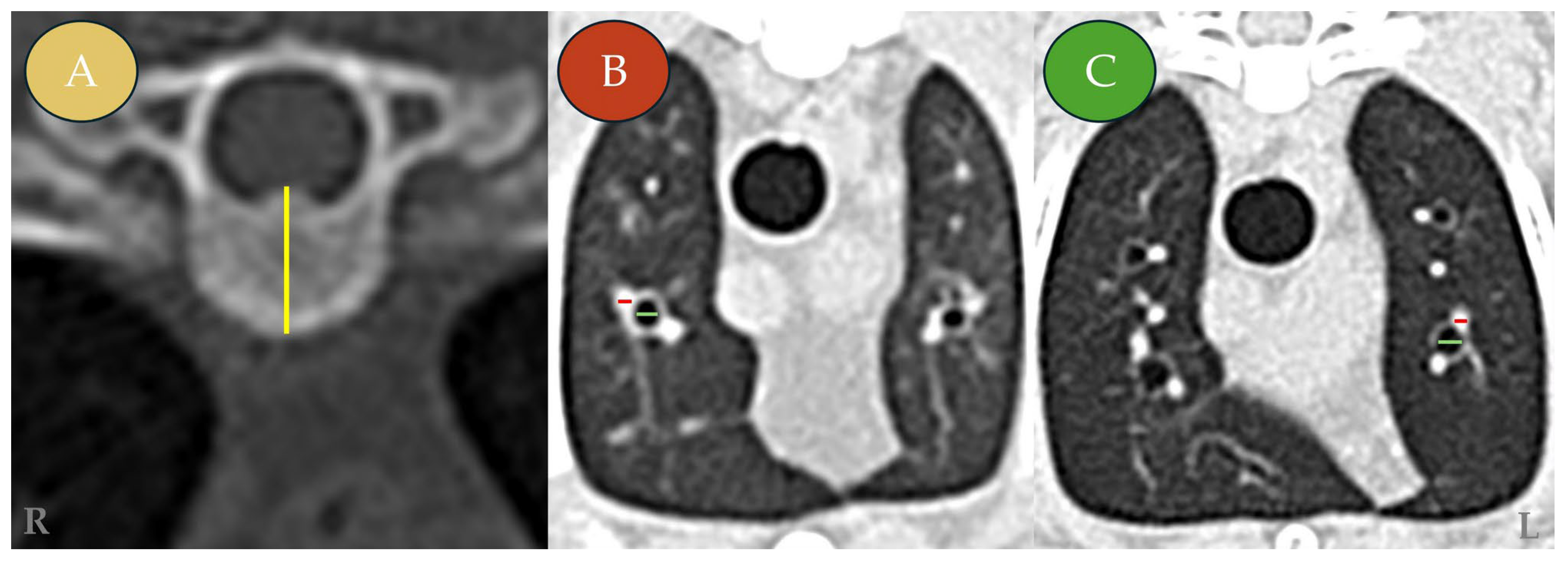 Bronchial and vascular luminal diameters were measured on axial images in which the structures appeared round or near-round, indicating a perpendicular orientation to the imaging plane. Minor cranial or caudal adjustments were allowed to ensure true transverse orientation, following previously described protocols [