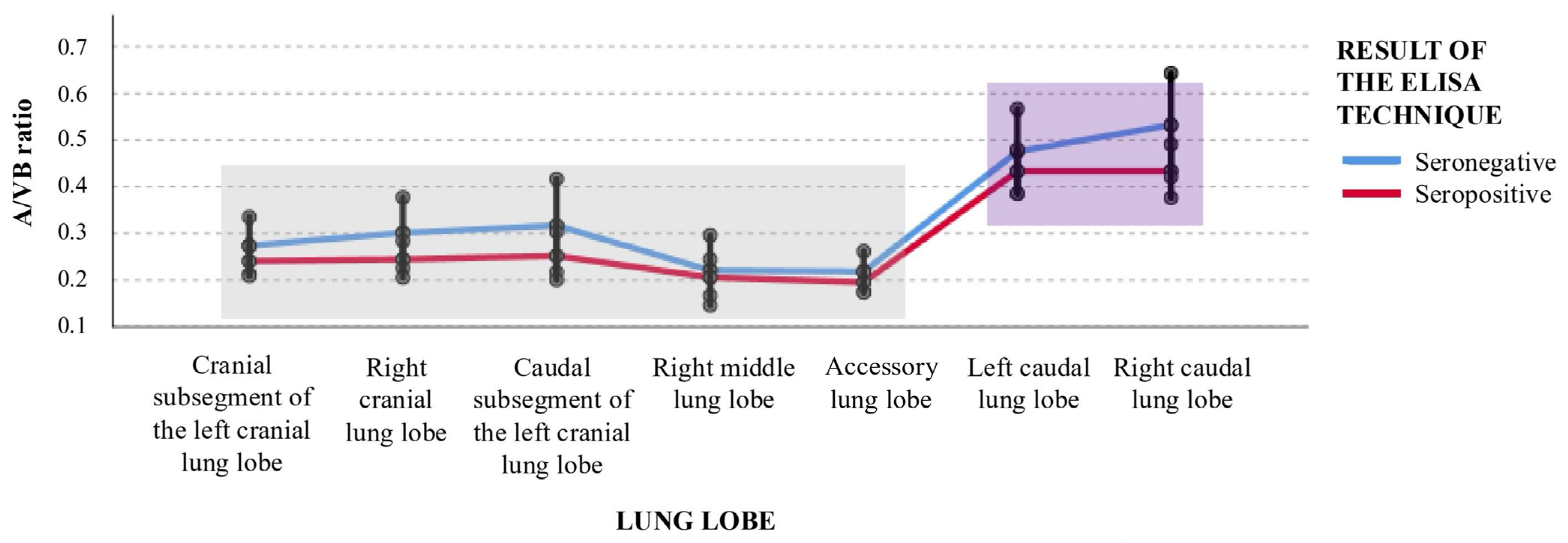 33], which can result in broader value ranges when measurements are obtained across multiple pulmonary regions. Importantly, similar lobar-dependent dispersion patterns were observed in both seropositive and seronegative cats, supporting a biological rather than methodological origin for this variability. Accordingly, the present results are interpreted in terms of relative lobar differences and group-level patterns rather than absolute diagnostic thresholds.