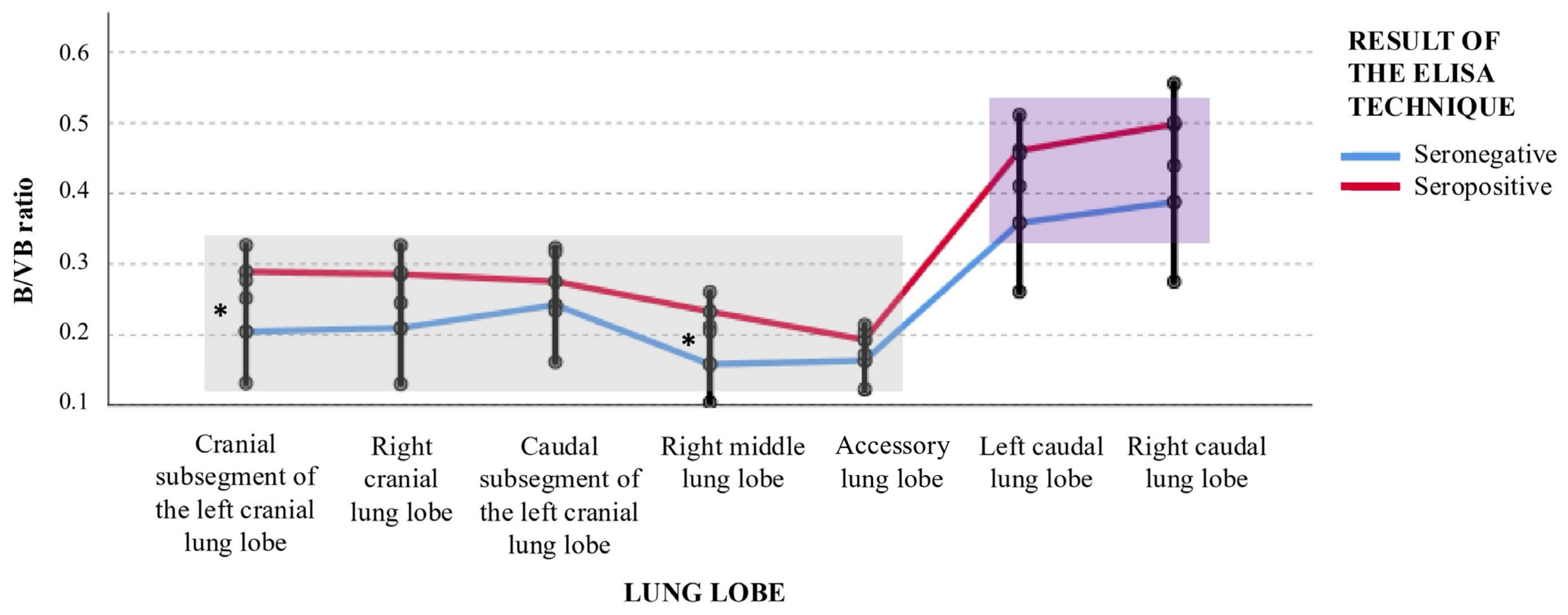The most relevant finding of this study was the significant elevation of B/VB ratios observed in symptomatic seropositive cats, particularly in the left cranial and right middle lung lobes. This pattern is consistent with the known pathophysiology of HARD, in which the arrival of immature