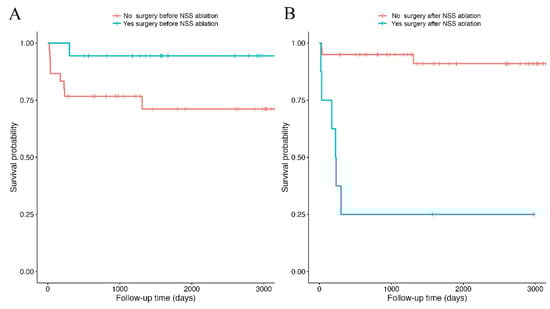 Survival curves computed using the Kaplan–Meier estimator. The curves represent the survival probabilities of discharged horses that did or did not undergo colic surgery prior to the index NSS ablation. (A), and horses that did or did not require laparotomy after initial discharge (B). Vertical bars on the curves indicate censored observations, and downward steps indicate death events.