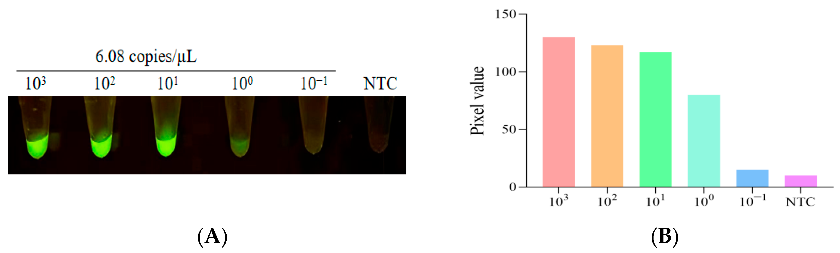 3.4. Sensitivity Result of the RAA-CRISPR/Cas12a Assay