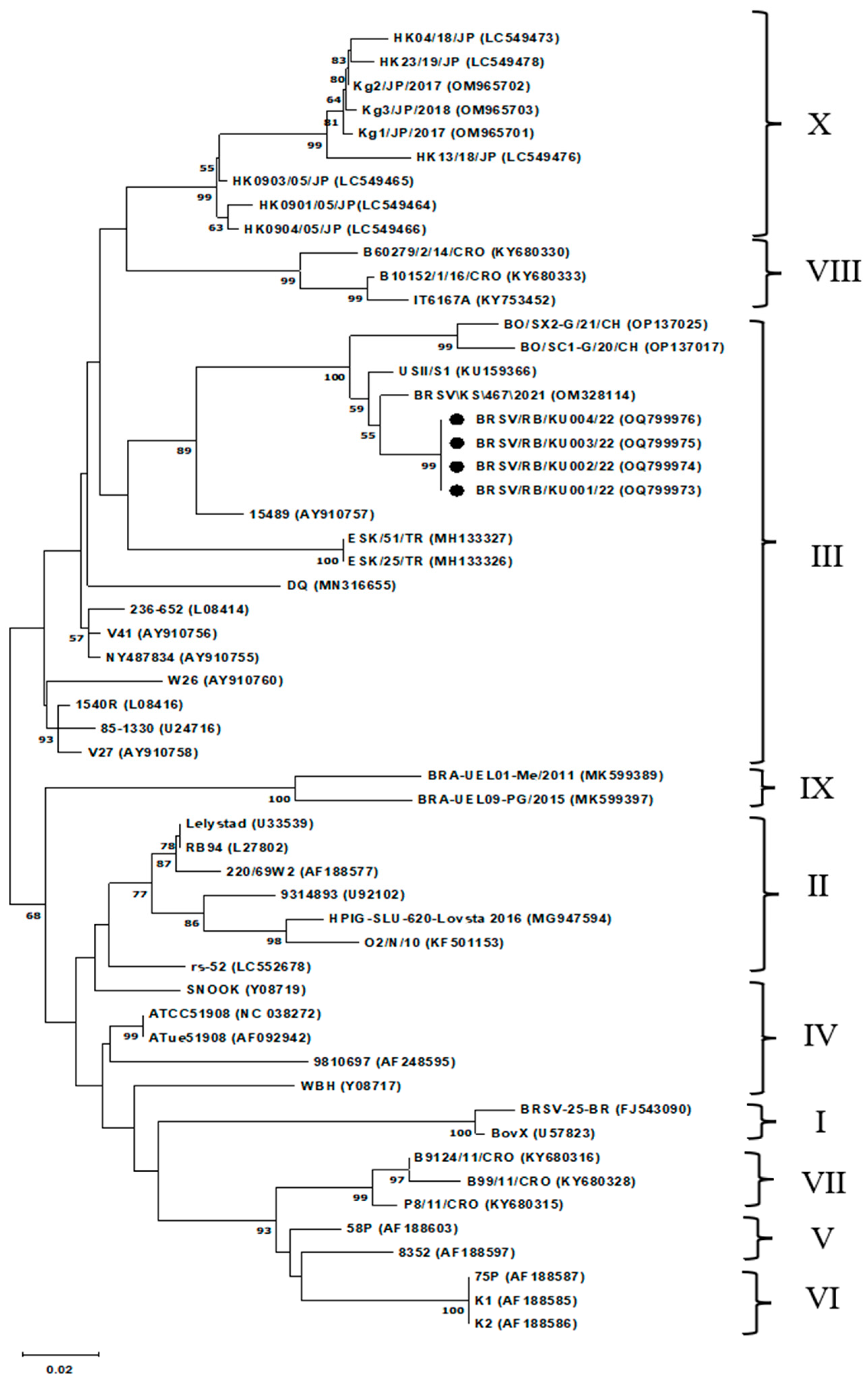 - Jia, S.; Yaoa, X.; Yanga, Y.; Niua, C.; Zhao, Y.; Zhang, X.; Pan, R.; Jiang, X.; Xiaobo, S.; Qiao, X.; et al. Isolation, identification, and phylogenetic analysis of subgroup III strain of bovine respiratory syncytial virus contributed to outbreak of acute respiratory disease among cattle in Northeast China. Virulence 2021, 12, 404–414. [Google Scholar] [CrossRef] [PubMed]