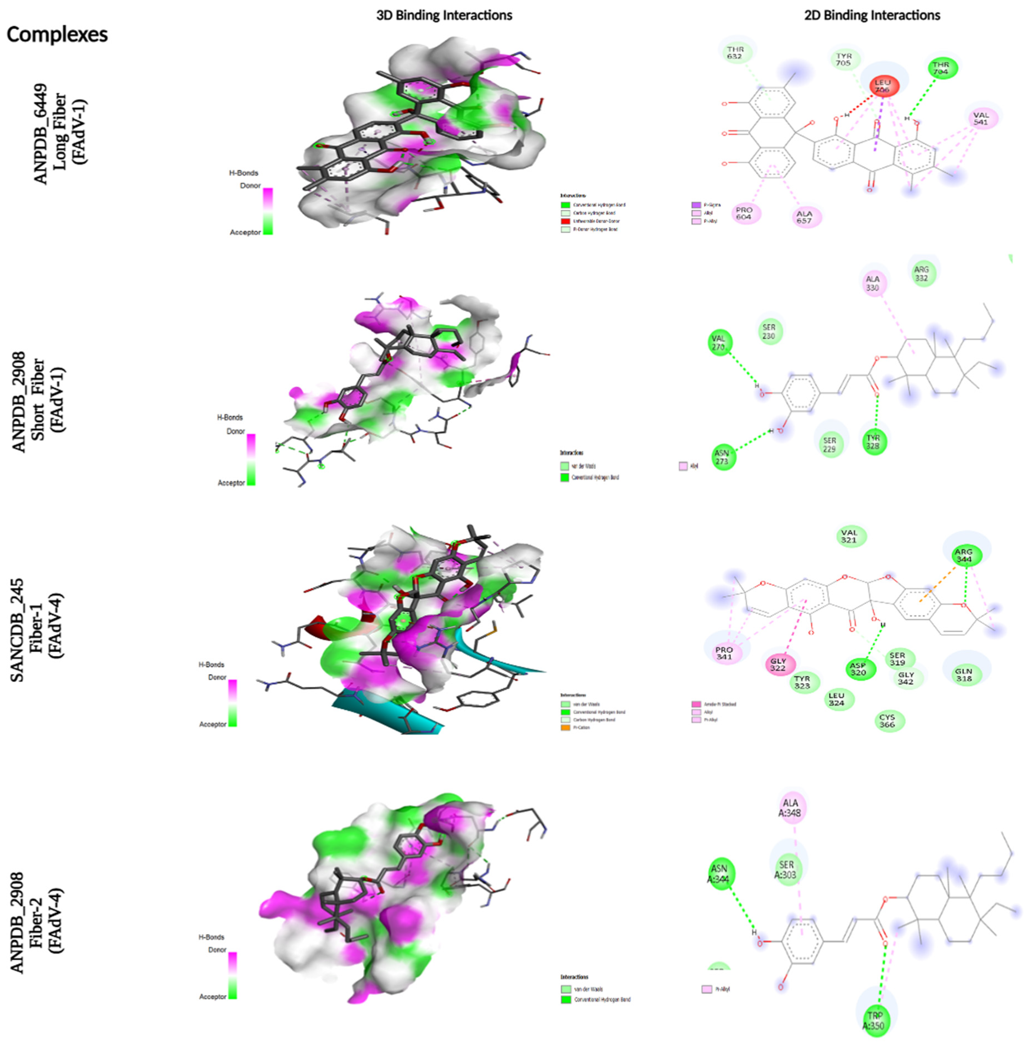 | Mol_ANPDB_6449 | Long Fiber FAdV-1 | −10.3 | Thr704 | 3 | Thr632, Tyr705 | Pro604, Ala657, VAL541 |