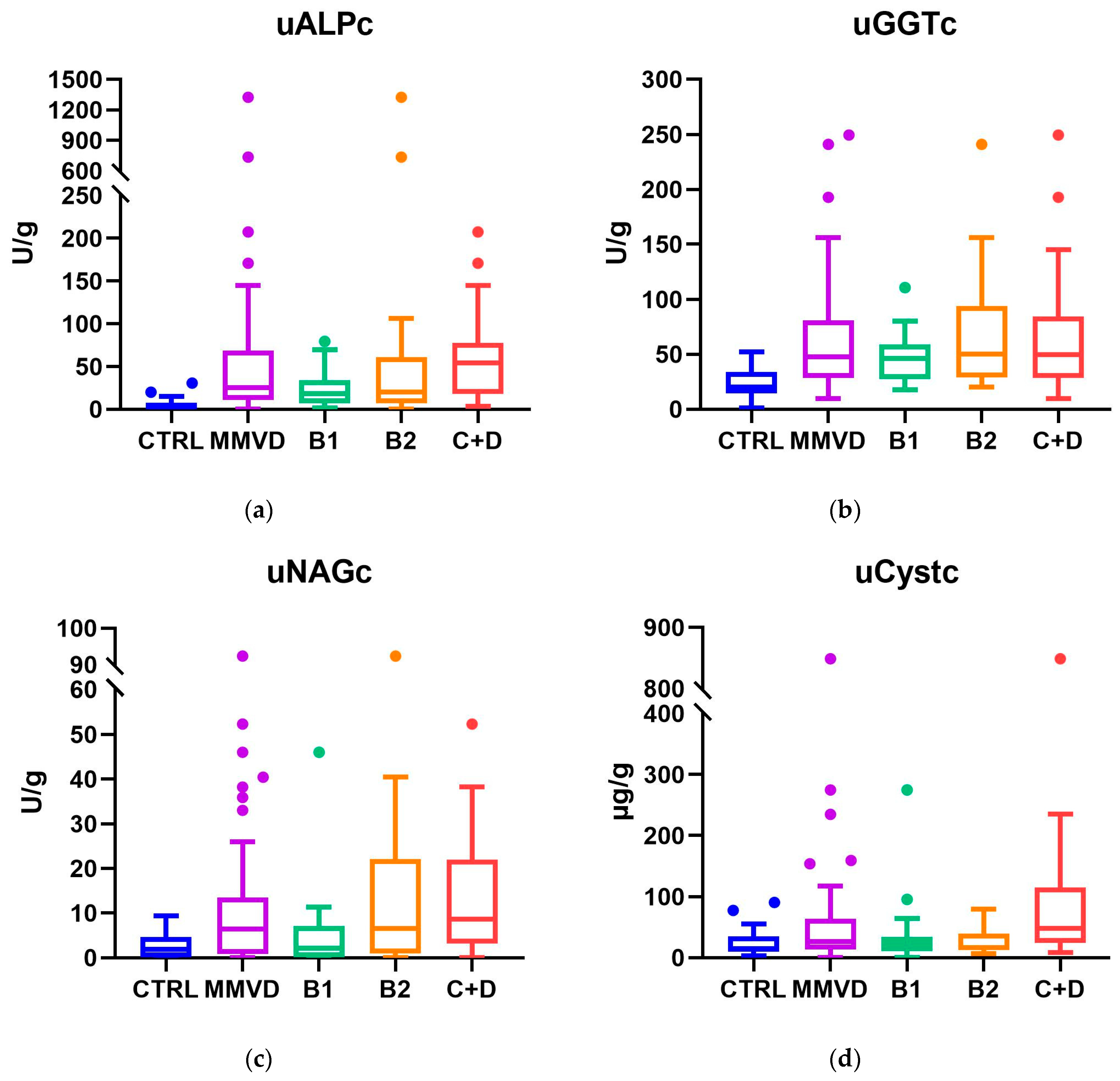 uNAG, uGGT, uCyst, and uALP values were expressed as ratios to uCr: uNAGc, uGGTc, uCystc, and uALPc, respectively.