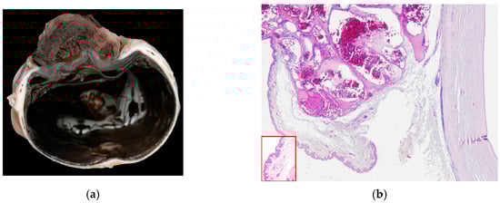(a) Dog, eye globe, macroscopic picture of cross-section: a large exophytic c-SCC affects the entire surface of the cornea, extending focally to the limbus; (b) dog, eye globe: histological subgross view of a typical exophytic c-SCC, not infiltrating the deeper corneal stroma (EE, 4×).