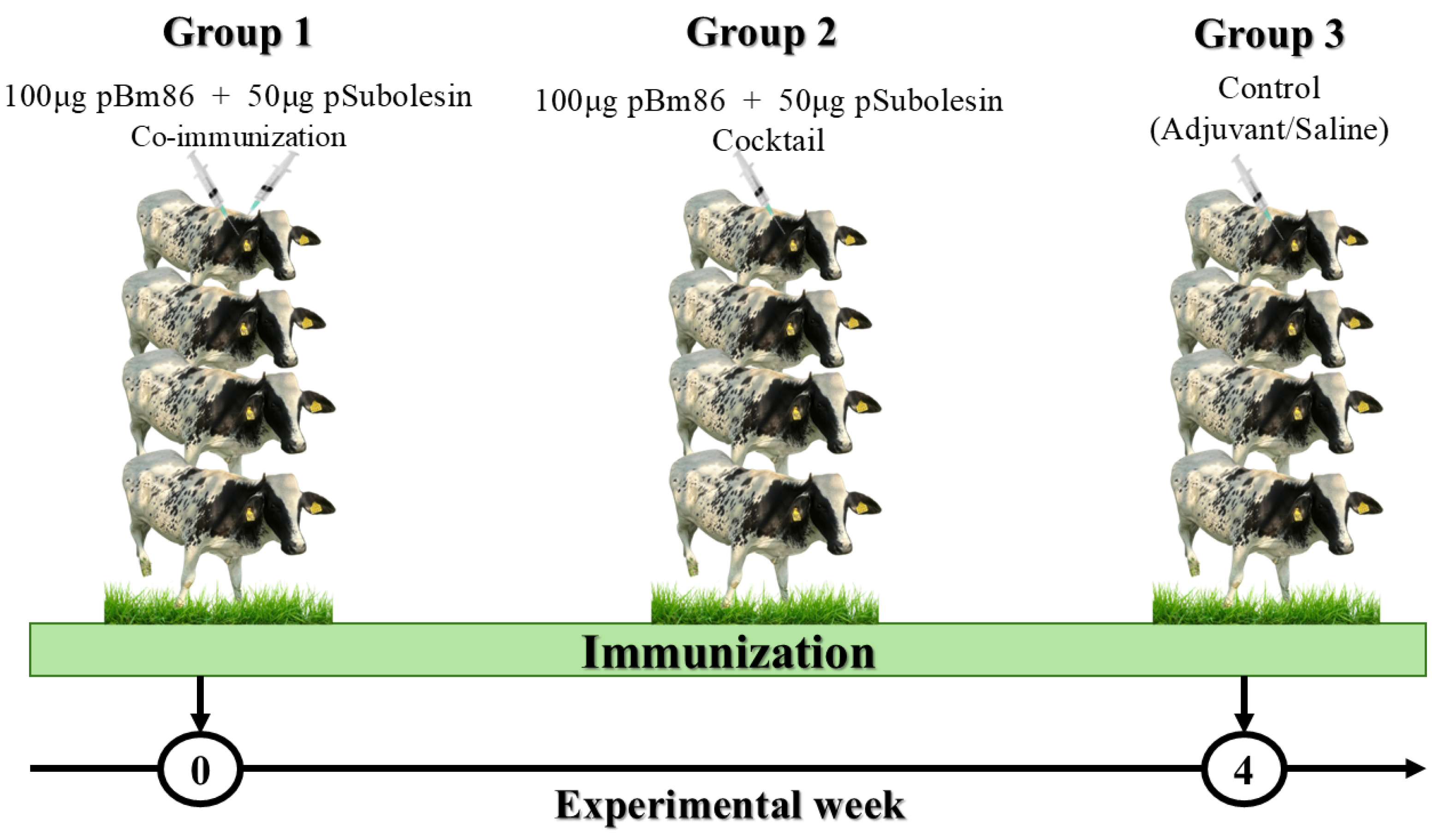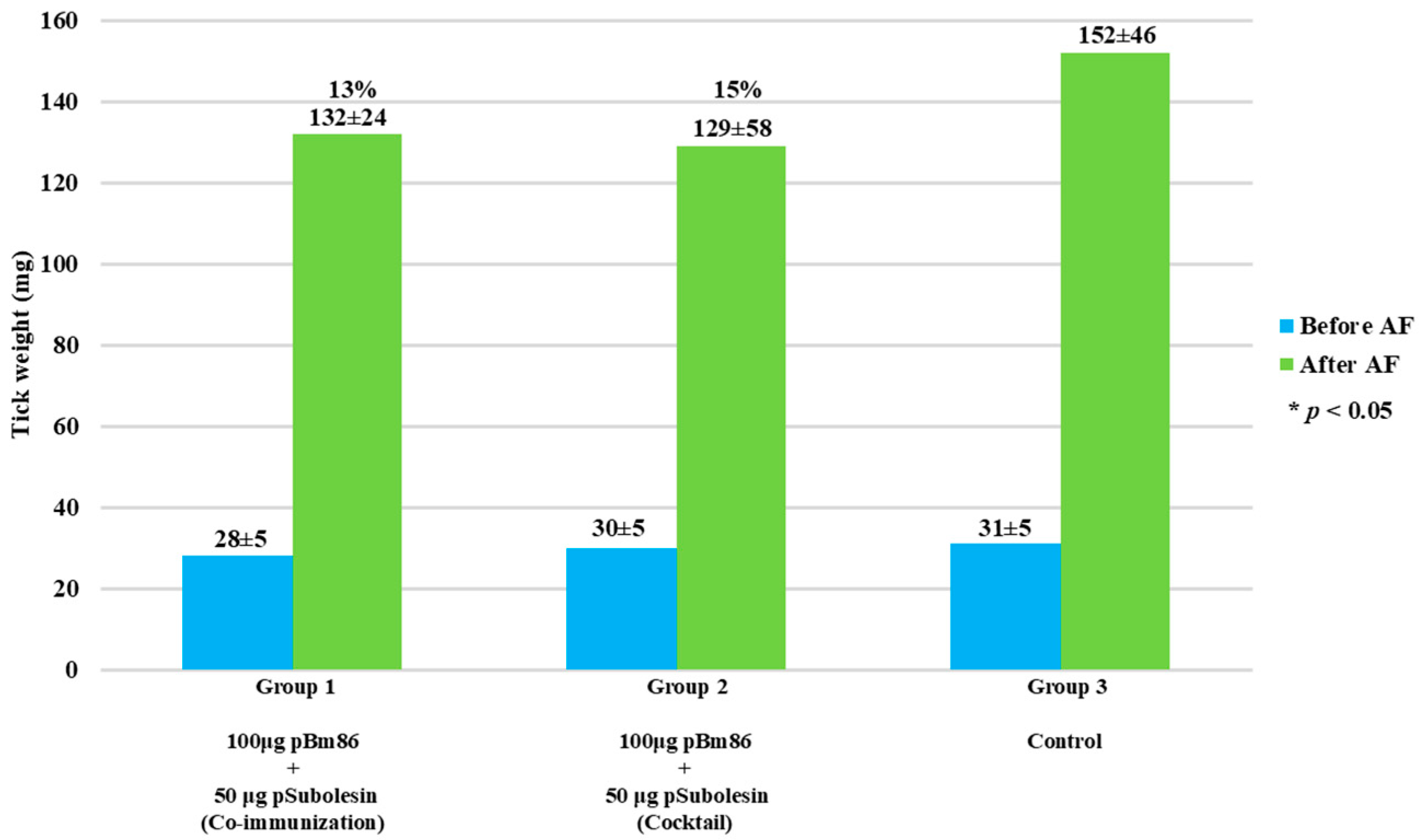 | Group 2 | 100 μg pBm86 + 50 μg pSubolesin (cocktail) | 59% * (110 ± 14) | 11% (132 ± 20) | 20% * (48 ± 8) | 25% * (23 ± 3) | 75% |