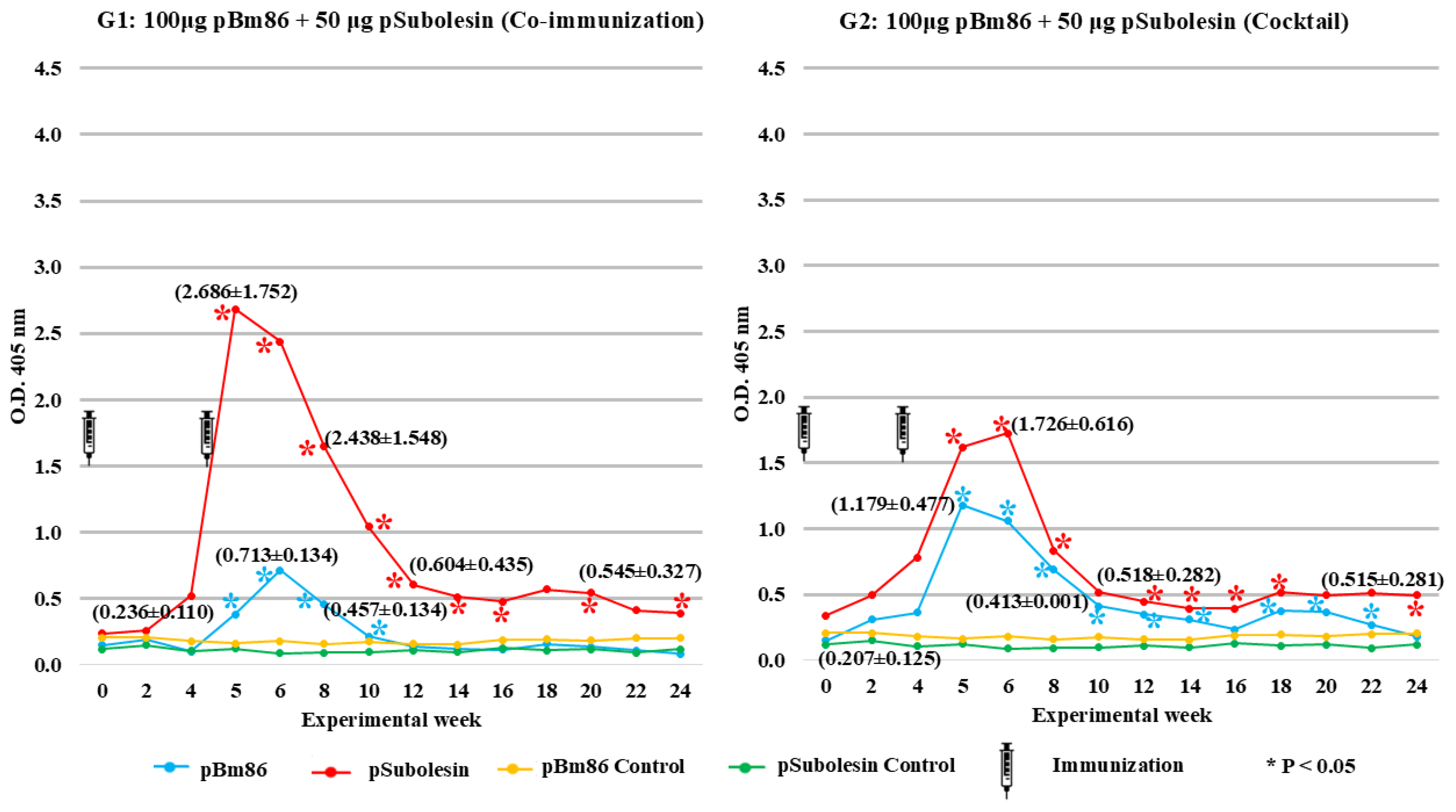| Group 1 | 100 μg pBm86 + 50 μg pSubolesin (co-immunization) | 22% (208 ± 12) | 7% (138 ± 7) | 16% (51 ± 2) | 23% * (24 ± 1) | 50% |