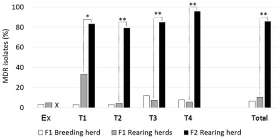 Proportions of multi-drug-resistant E. coli from ‘low’ (F1) versus ‘high’ (F2) antimicrobial-drug-usage farms, at individual sampling visits (Ex to T4) and in total. Dotted lines show comparisons made between rearing herds, with significant differences indicated: * p < 0.05; ** p < 0.001. ‘X’: no Ex visit to F2.