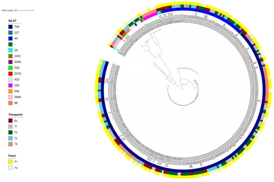 Isolates of the most common ST (744) formed three distinct clusters. A previous study [36] had identified a transposon encoding MDR that also harboured heavy metal and biocide resistance genes and was integrated in the chromosome of ST744 isolates from F1 at time points T1–T3. Further examination of the gene content based on the clustering of ST744 isolates in the dendrogram indicated that this genomic island was present on both farms and at multiple time points.