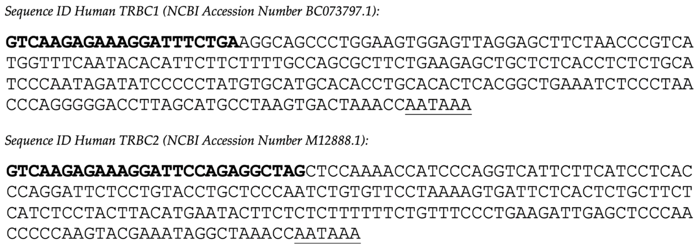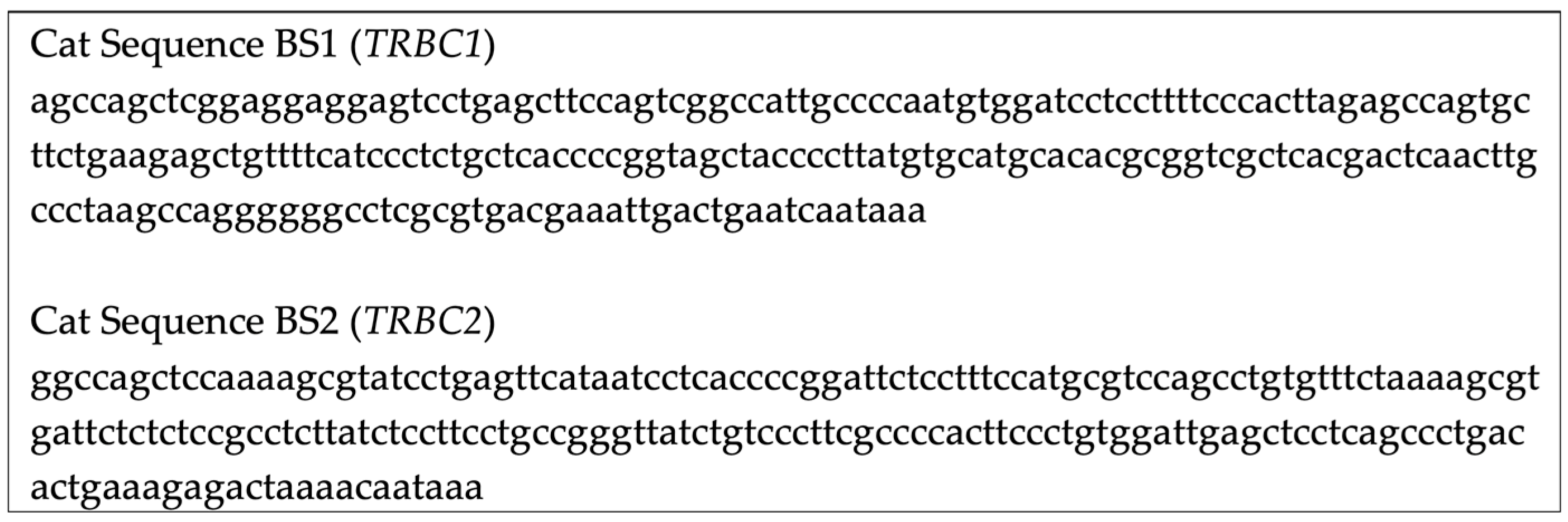 2.2. PCR and Sequencing-Based Confirmation of Cat and Dog TRBC1 and TRBC2 Sequences