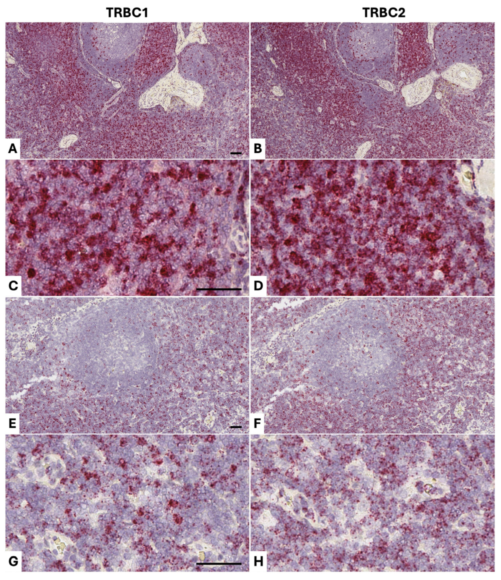 | Dog 7 | Beagle | M | 10Y | Mandibular lymph node | T-cell lymphoma | 1.12:1 | 0.125:1 (8:1) | TRBC2-restricted. Widespread weakly TRBC2+ cells with occasional strongly stained TRBC1+ and TRBC2+ tumor-infiltrating benign T-cells, but the TRBC1+ T-cells are markedly more strongly stained than the TRBC2+ cells. |