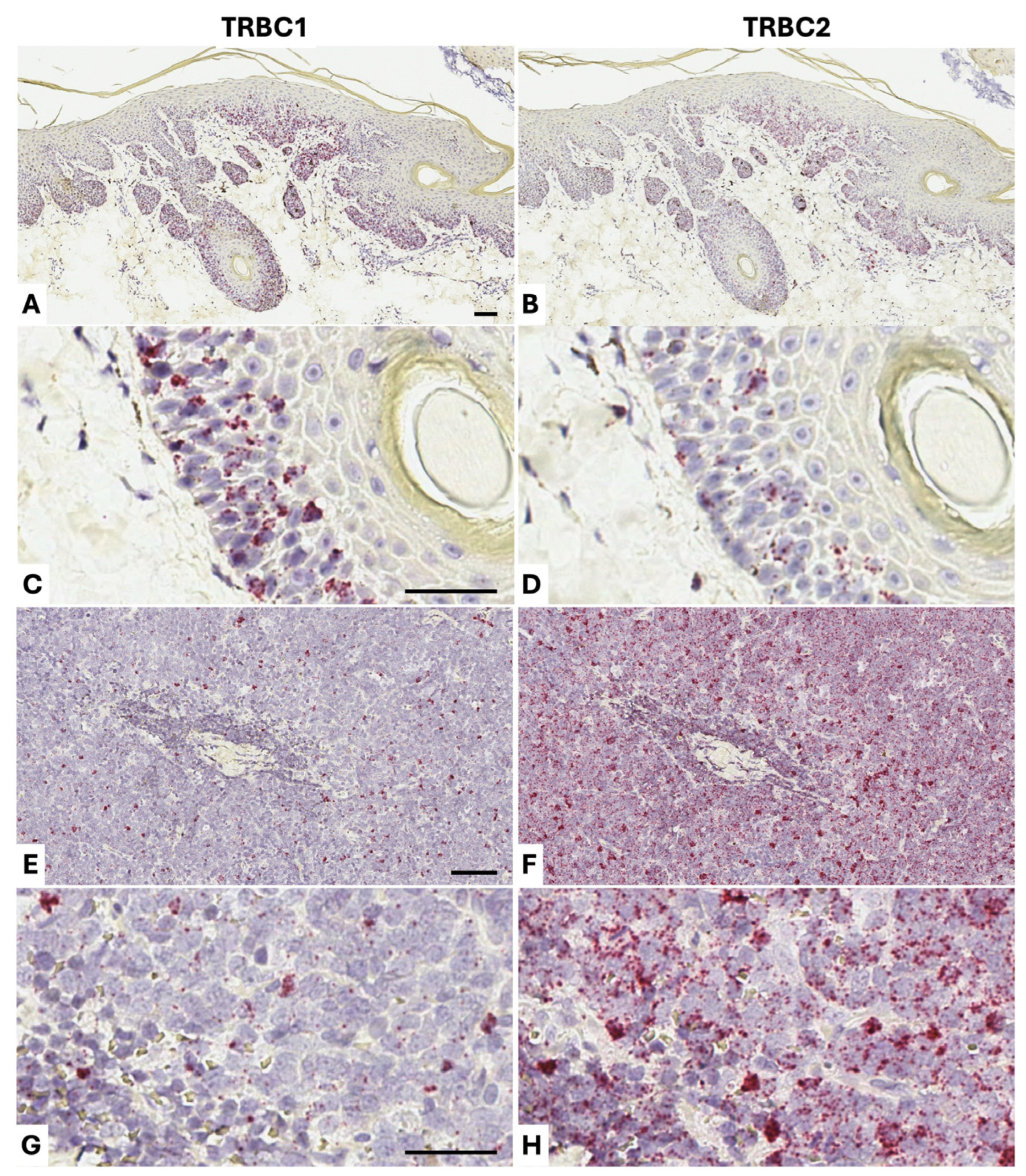 - Kaistha, A.; Situ, J.J.; Evans, S.C.; Ashton-Key, M.; Ogg, G.; Soilleux, E.J. A definitive TCRbeta1/TCRbeta2 antibody pair for determining T-cell monotypia as a surrogate for clonality in lymphoma diagnosis in formalin fixed paraffin embedded material. medRxiv 2026. medRxiv:2026.2002.2013.26346202. [Google Scholar] [CrossRef]