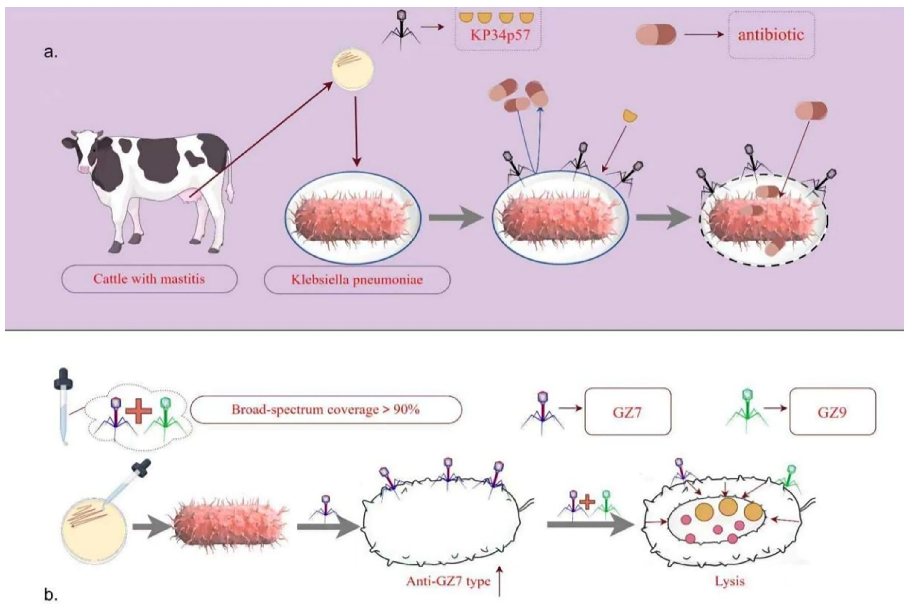 - Luo, Z.; Gong, S.; Lu, B.; Han, G.; Wang, Y.; Luo, Y.; Yang, Z.; Cao, S.; Yao, X. Isolation, Genomic Analysis, and Preliminary Application of a Bovine Klebsiella pneumoniae Bacteriophage vB_Kpn_B01. Front. Vet. Sci. 2021, 8, 622049. [Google Scholar] [CrossRef]