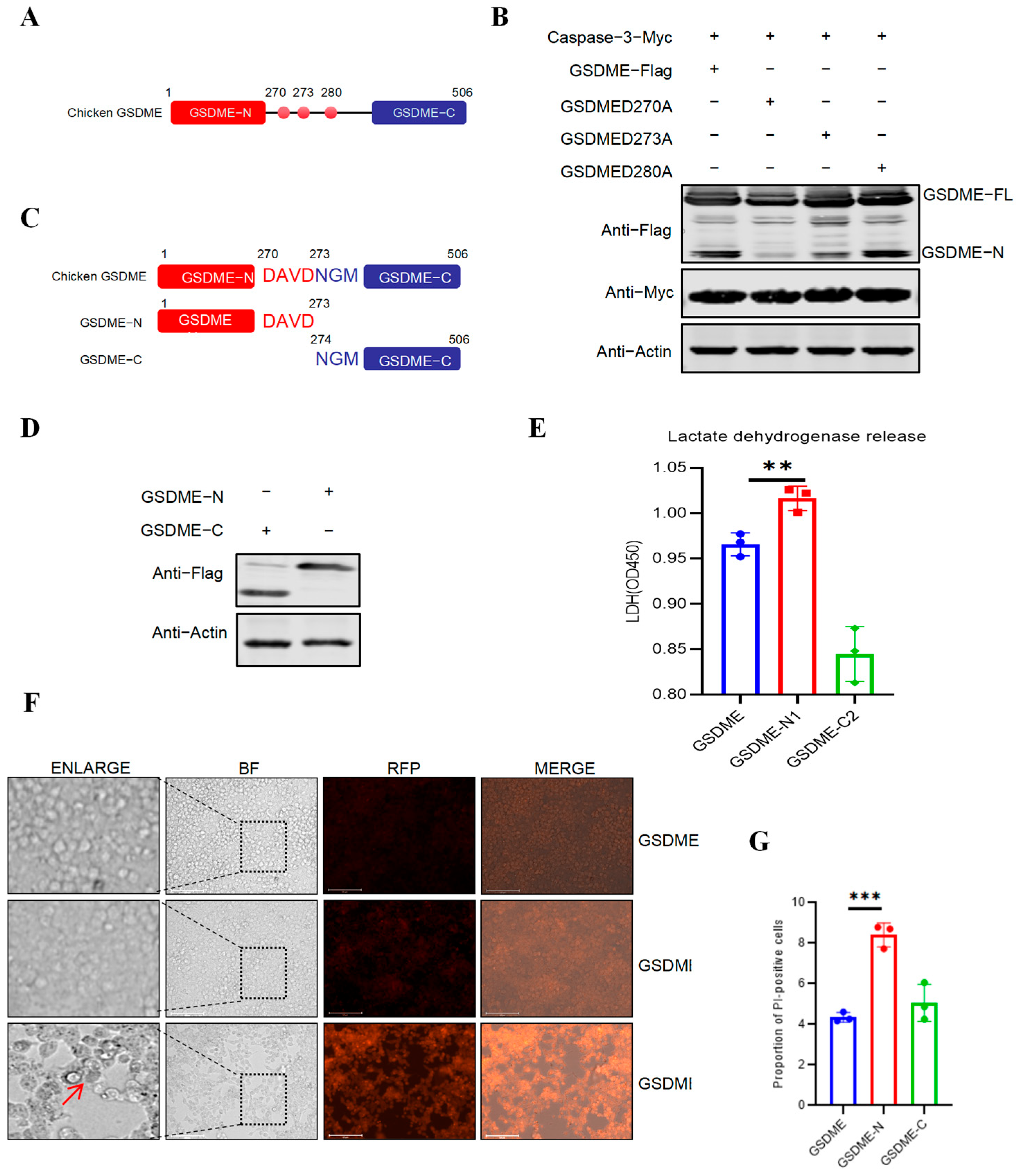 3.3. Chicken Caspase-3 Specifically Cleaves GSDME at Position D270, Thereby Inducing Pyroptosis