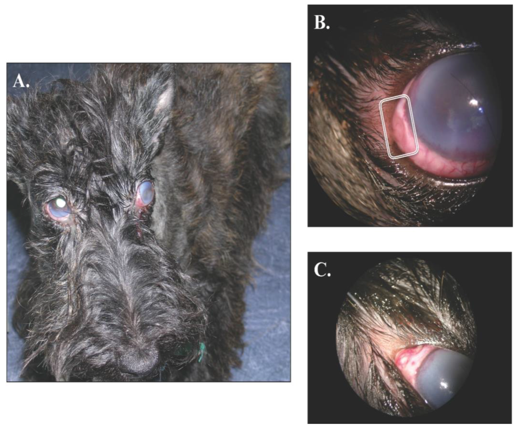 A 1.5 year-old female Scottish Terrier was referred for severe acute bilateral kerato-uveitis. About 15 days prior to referral, the dog had developed a mild corneal perikeratic edema with perilimbal episcleral diffuse hyperemia. The complete blood cell count was normal and serological tests (Leishmania infantum; Toxoplasma gondii; Ehrlichia canis; Leptospira spp.; Borrelia burgdorferi) came back negative. For two weeks, topical neomycin and dexamethasone were prescribed three times a day in addition to oral amoxicillin/clavulanic acid (12.5 mg/kg bid) and prednisolone (1 mg/kg sid) for two weeks. Despite these treatments the lesions were strongly worsening with the onset of visual impairment, so the dog was referred to our clinic.