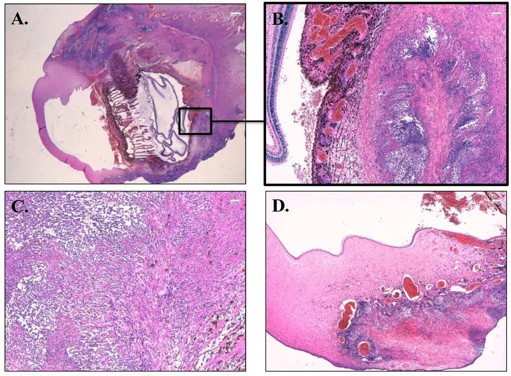 Histopathology of the left eye. Panel A shows a section of the entire globe. Note the severe infiltration of the sclera, perilimbal cornea, uveal tract, and retrobulbar cone. The following panel B is a 40× close-up, highlighting the infiltration of the sclera extending to the choroid. Note the degenerating collagen mesh with pyogranulomas; Panel C shows the pyogranuloma even closer (400×) where neutrophils and macrophages can be observed in the necrotic collagen mesh. Finally; panel D shows the perilimbal zone where the pyogranuloma is noticeable with hemorrhages and neutrophilic infiltration of the corneal stroma.