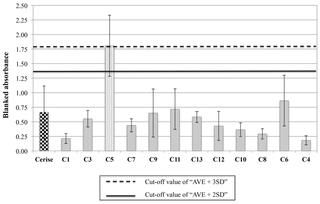 Two months after prednisolone discontinuation, serum samples from this dog and 13 healthy dogs were analyzed using a commercial anti-human myeloperoxidase (MPO) detection ELISA kit (Diamedix Inc., Miami Lakes, FL, USA). The kit anti-human secondary antibody was substituted with an anti-dog secondary antibody (Santa Cruz Inc., Dallas, TX, USA) to match our patient’s species. The plate was then read using a multi-function plate reader (Synergy 2, BioTek inc., Winooski, VT, USA). We blanked all the absorbance results with the absorbance from the no serum control well. Using the values established in the control dogs (“OD average + 2 or 3 SD”, with or without the outlier dog #5), the patient’s serum was negative for anti-MPO antibodies (Figure 3). Curiously, the outlier “control” dog #5 was borderline positive with a 3SD cut cut-off and fully positive with a 2SD cut-off. We therefore explored its recent medical history into more details, and learned that the dog had had some diarrhea the week prior to the blood collection. Interestingly, anti-MPO antibodies have been already detected in intestinal diseases in both humans and dogs [19,20,21].