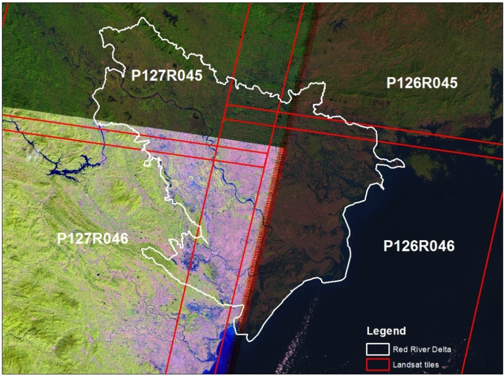Landsat tiles covering the Red River Delta of Vietnam.