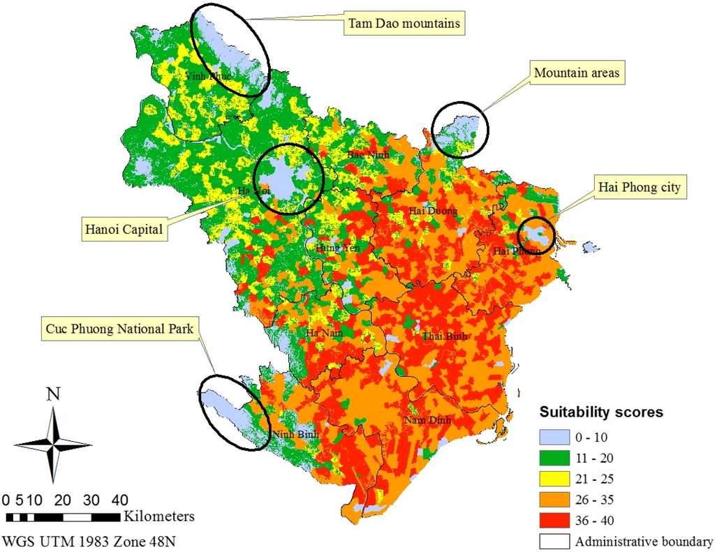 The highest suitability score areas were shown in red, followed by orange. Yellow, green, and blue areas have lower suitability scores. These areas (suitability scores ranging from 0–10, 11–20, and 21–25, respectively) were mostly located to the west and northwest of the Red River Delta. The areas with high suitability scores (ranging from 26–40), as shown in red and orange, were chosen as the focus areas for the alternative vaccination program against HPAI H5N1.