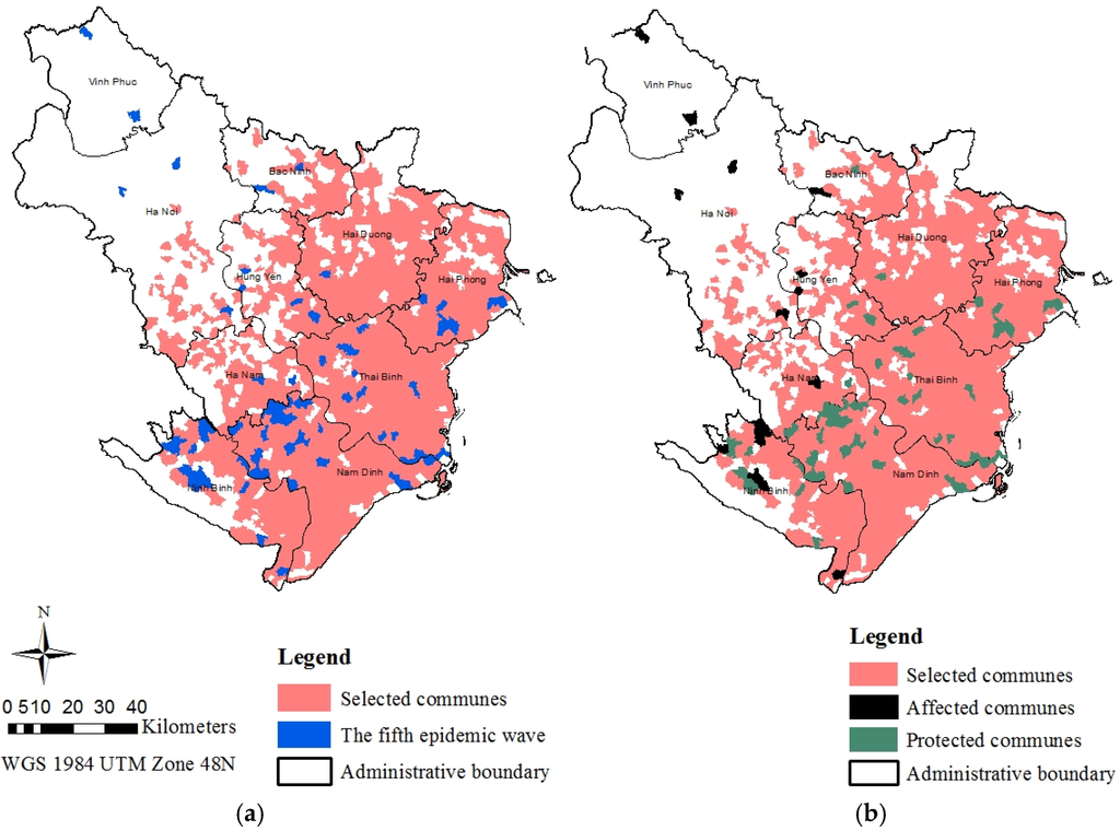 (a) Spatial distribution of the fifth epidemic wave in the Red River Delta and the focus areas for the alternative vaccination program; and (b) spatial distribution of the estimated affected communes and protected communes under the alternative vaccination program.