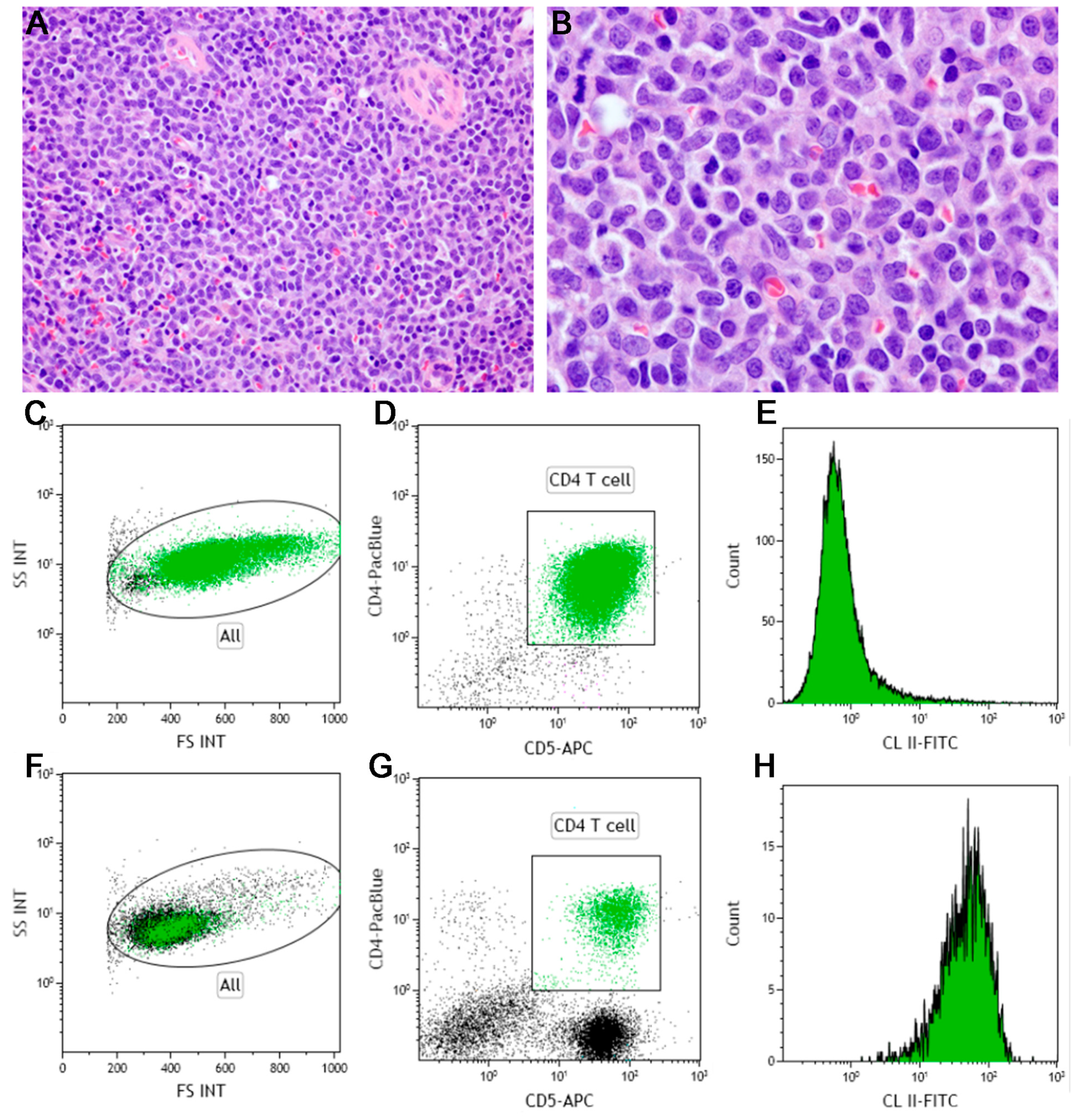 | TZL | Architecture: Nodular | CD45−, CD3+, CD5+, CD21+, CD4+/−, CD8+/− | Histologic Variant of PTCL, NOS | CD2+, CD3+, CD5+, CD4+ |