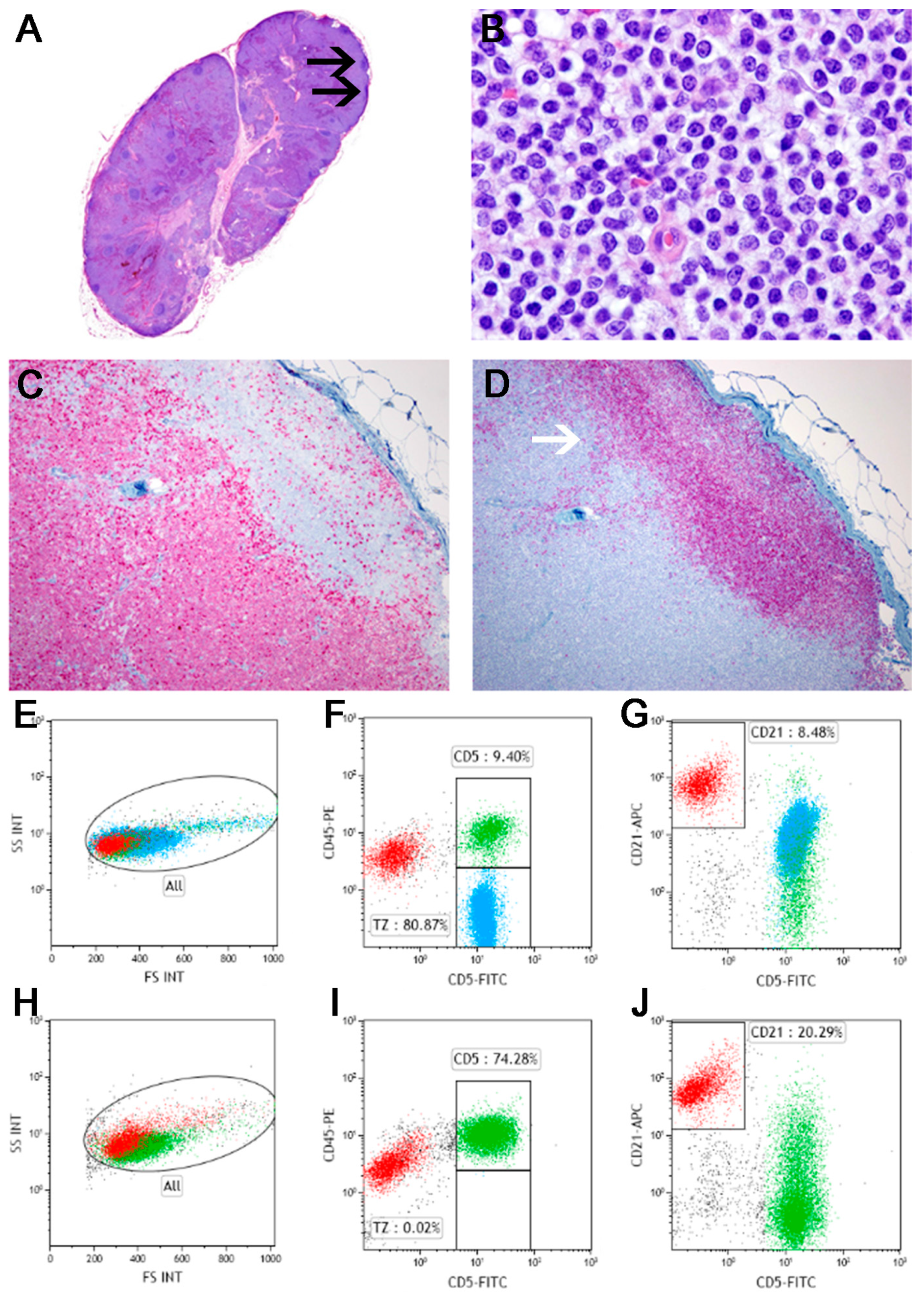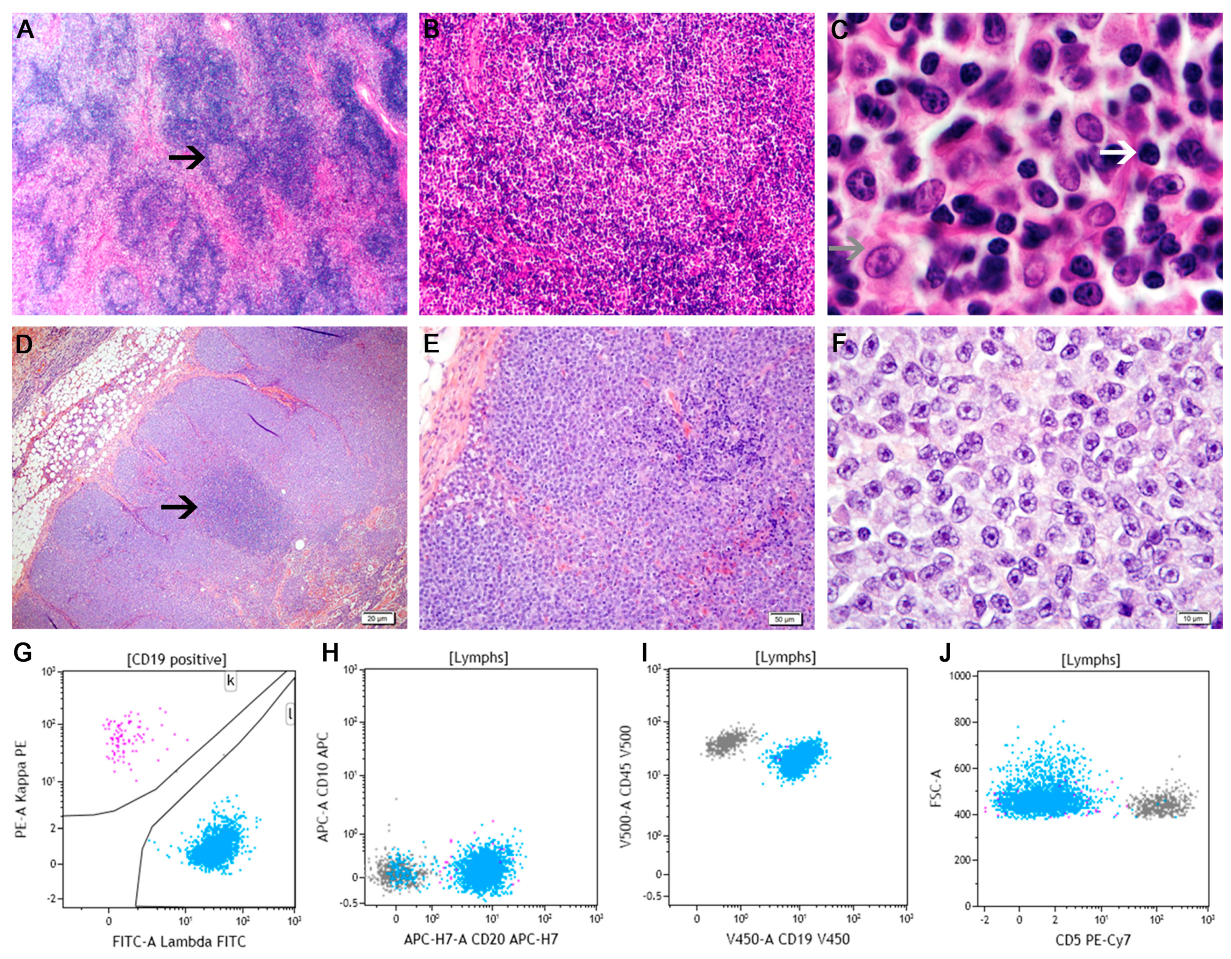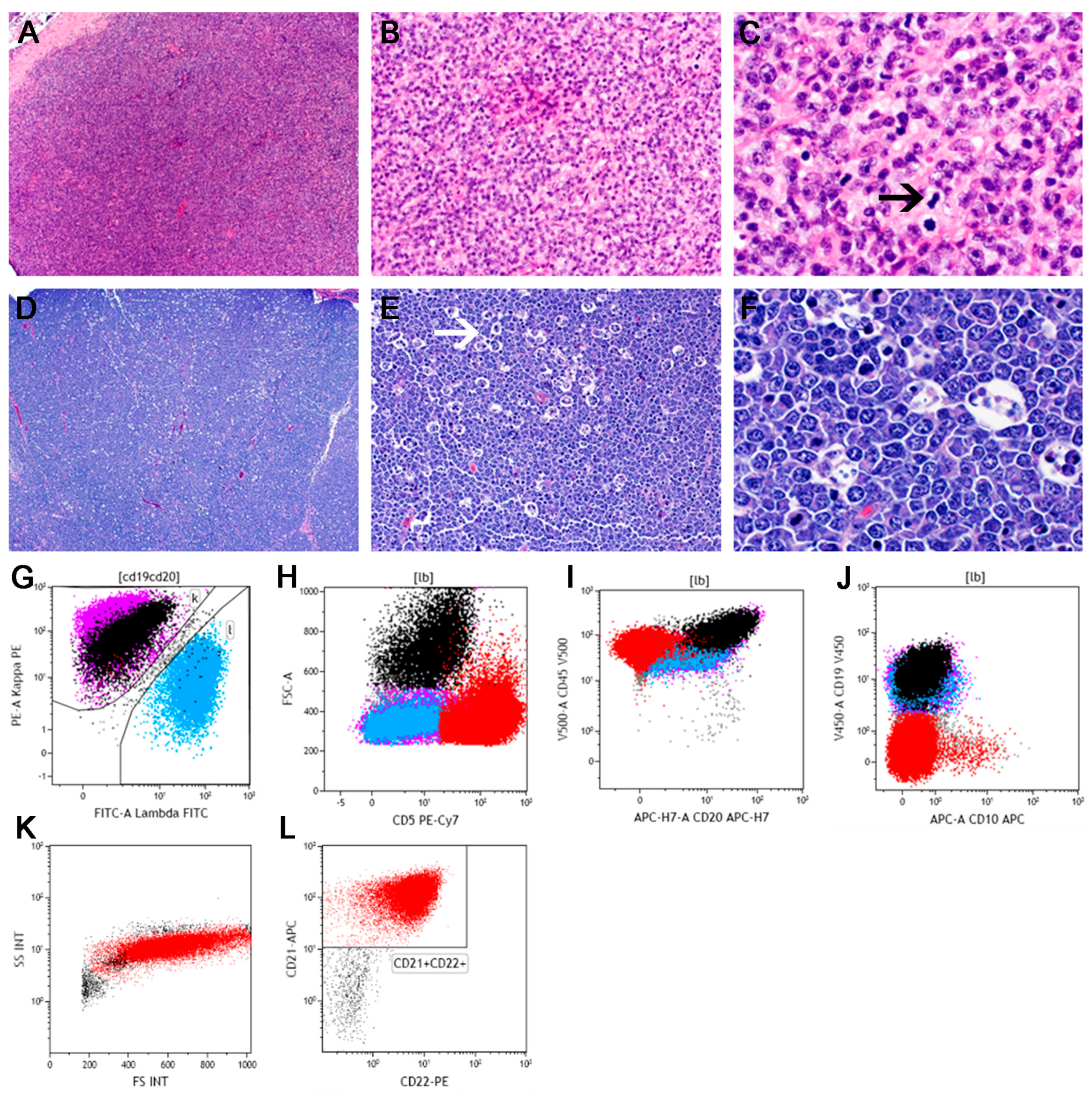 | DLBCL | Architecture: Diffuse | CD20+, CD21+, CD45+, CD79a+, Pax5+, MHC II+ | Architecture: Diffuse | sIg+, CD45+, CD20+, CD22+, CD79a+, Pax5+, CD10+/− |