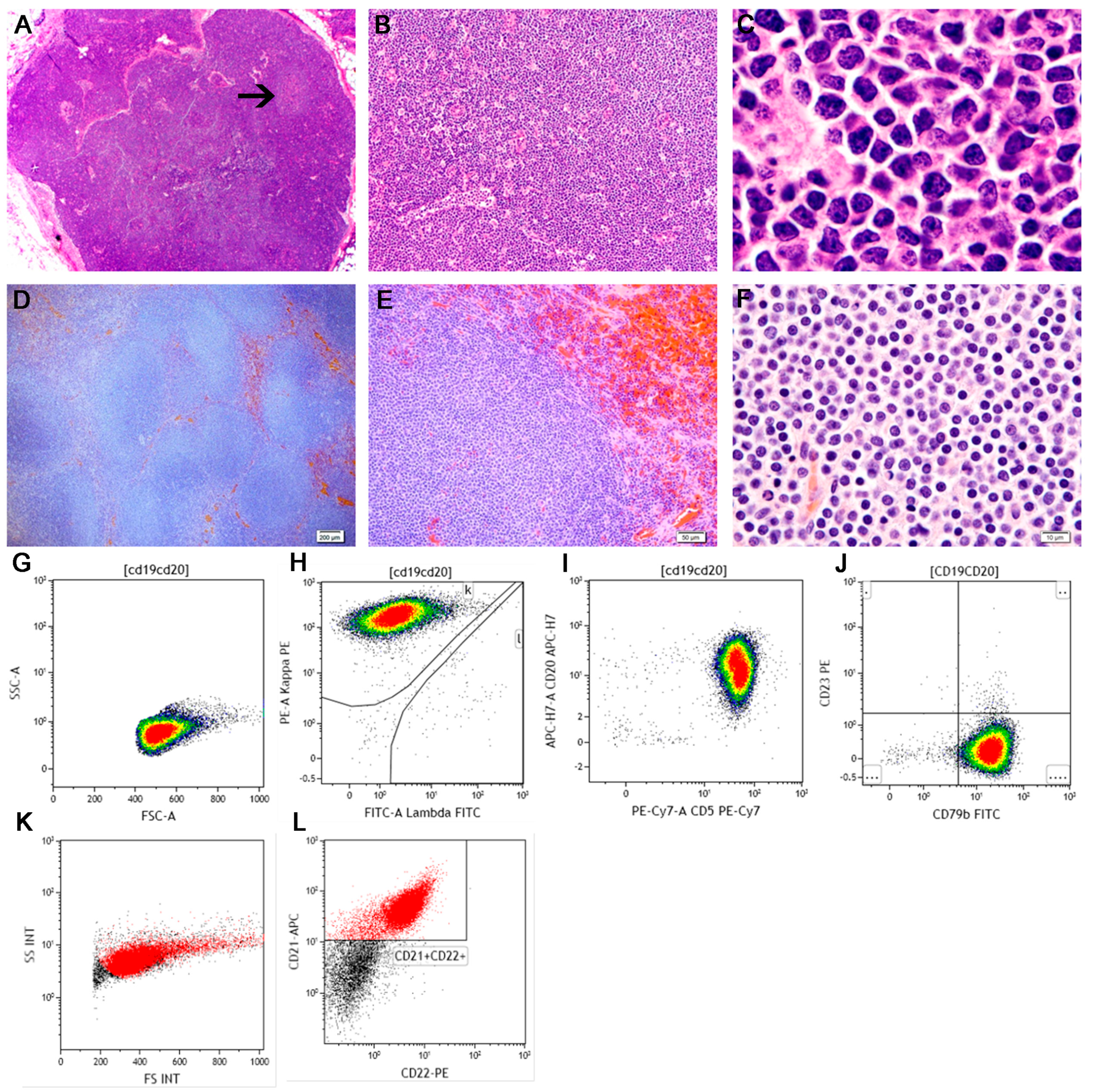 | Follicular Lymphoma | Architecture: Nodular | CD20+, CD21+, CD45+, CD79a+, MHC II+ | Architecture: Nodular | sIg+, CD45+, CD19+, CD20+, CD22+, CD79a+, Pax5+, CD10+, BCL6+, BCL2+ |