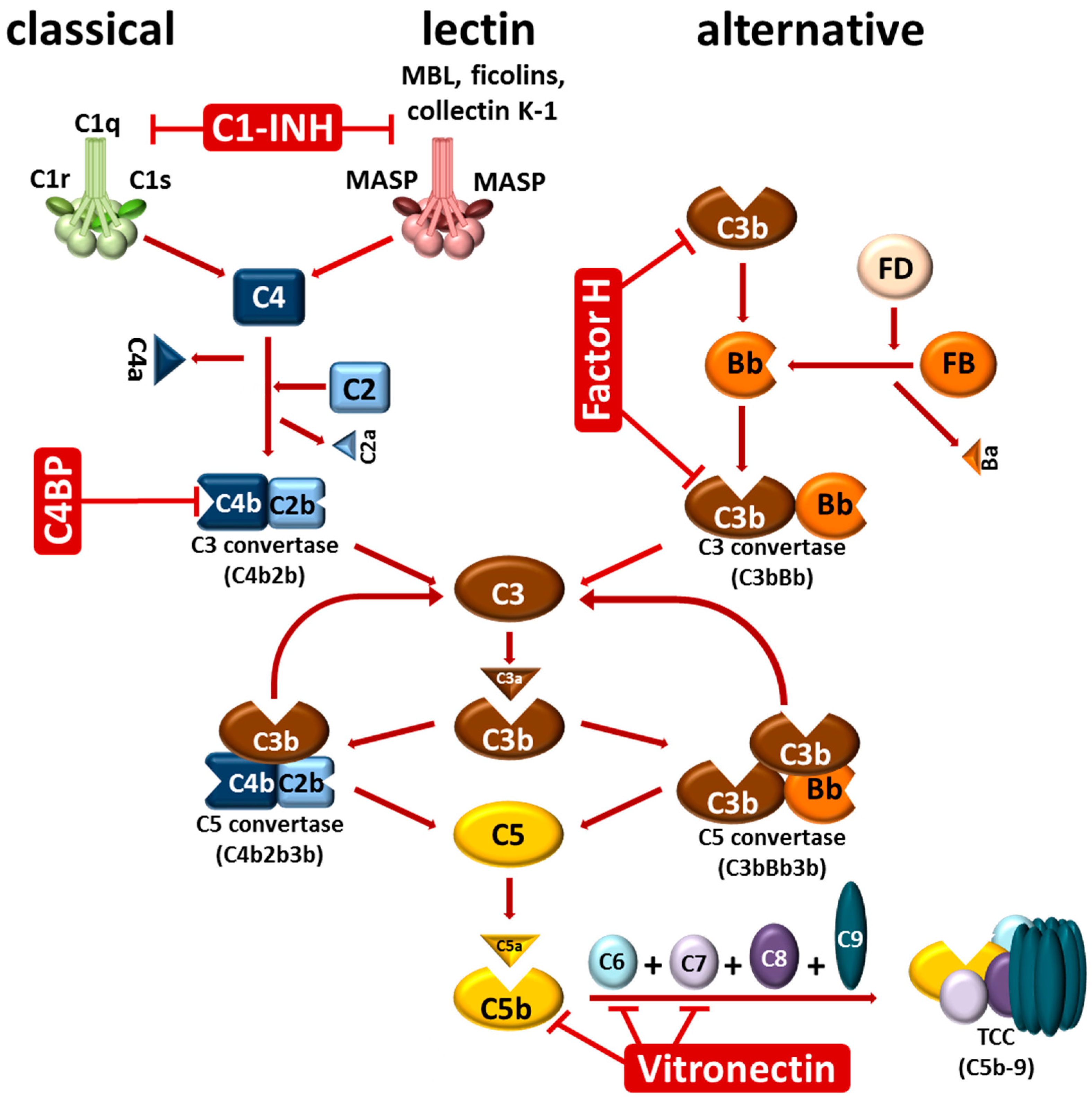 The complement system as a central part of innate immunity represents a sophisticated network of more than 50 proteins, including inactive precursor molecules, fluid-phase and membrane-bound regulators, as well as distinct inhibitors [14,15,16,17,18]. As a first-line of defense, the most important effector function of this tightly-controlled surveillance system is the discrimination between “self” and “non-self”, leading to an immediate recognition and elimination of invading microorganisms, and thereby protecting the vertebrate host against bacterial infections. The human complement system is activated through three canonical routes: the classical, the lectin, and the alternative pathway, all of which converge in the generation and deposition of the central complement component C3b by the formed C3 convertases [15,17,19] (Figure 1). Deposition of large quantities of C3b on microbial surfaces is a prerequisite for opsonization and, ultimately, the elimination of invading pathogens via phagocytosis. Following generation of the C5 convertases, complement component C5 is cleaved into C5a and C5b which initiates the unidirectional, sequential binding of the late components C6, C7, and C8. Finally, the surface-associated C5b-8 complex initiates the polymerization of numerous C9 molecules (n = 10–16) following the formation of the bacteriolytic terminal complement complex (C5b-9, TCC) resulting in lysis of the invading pathogen [17,18]. Owing to the potentially deleterious effects of the complement cascade, the complement is tightly controlled at different levels by a number of soluble and membrane-anchored regulators, thus protecting self-surfaces from excessive activation and harmful attack by activated effector molecules [19]. The main soluble regulators of the classical and lectin pathway include C1 esterase inhibitor (C1-INH) and C4b-binding protein (C4BP), while the alternative pathway is primarily regulated by Factor H and Factor H-like protein 1 (FHL-1), and the terminal pathway by vitronectin [19,20].